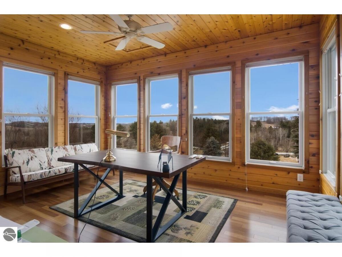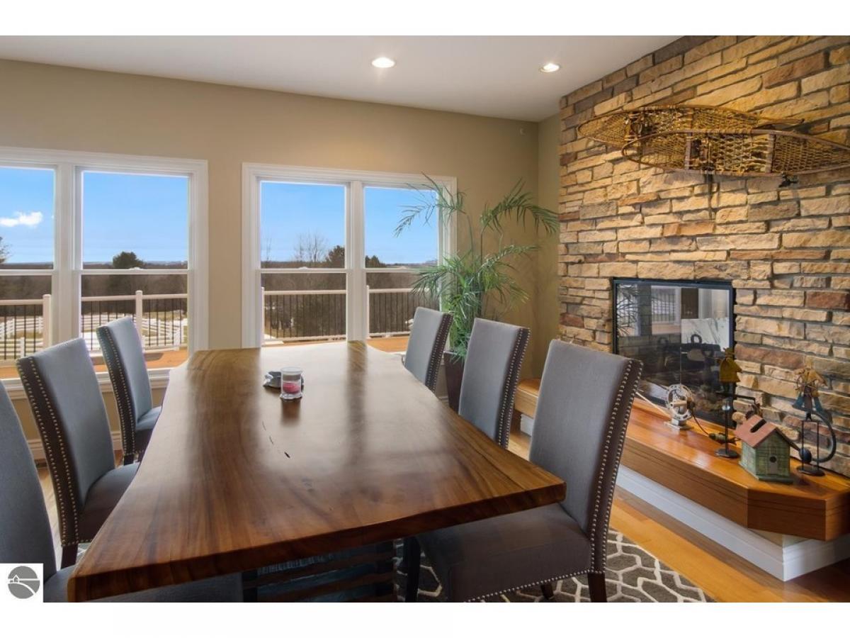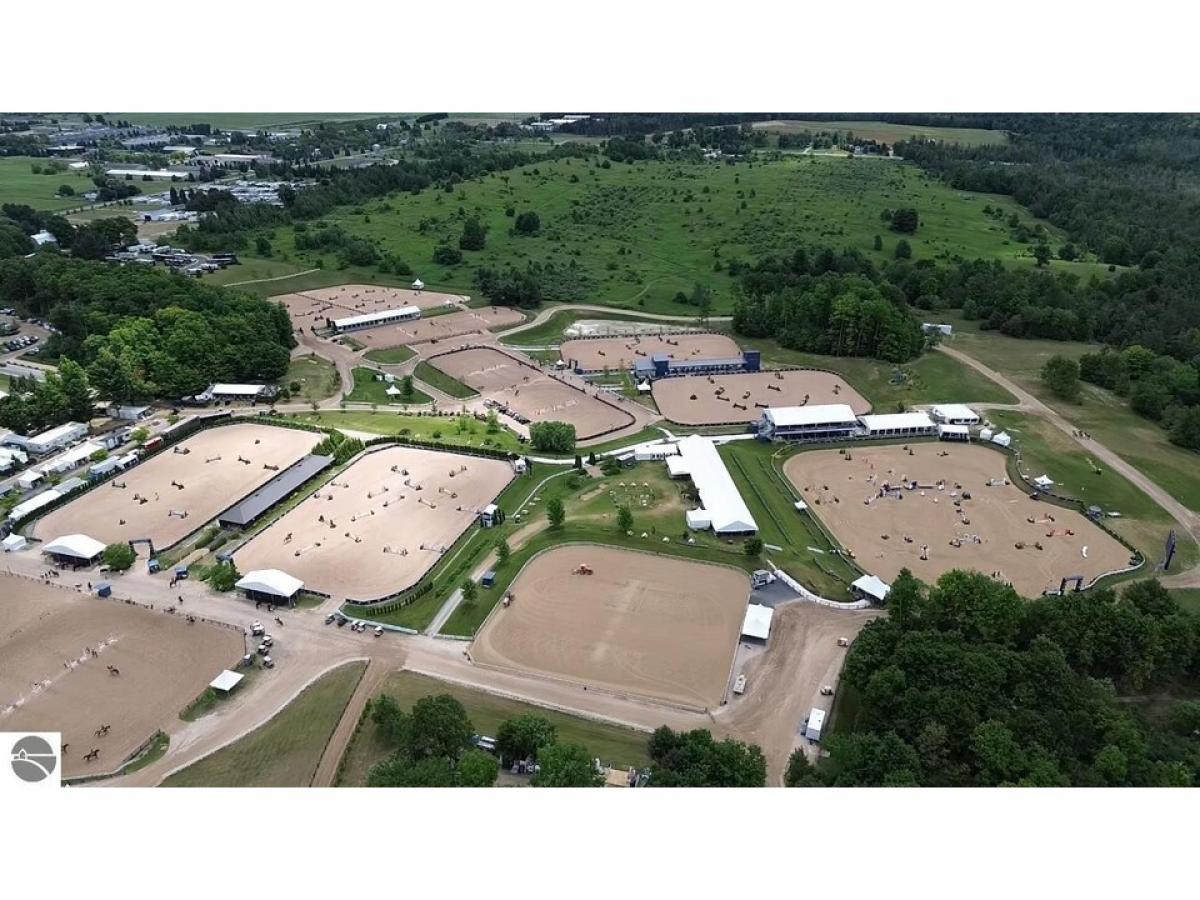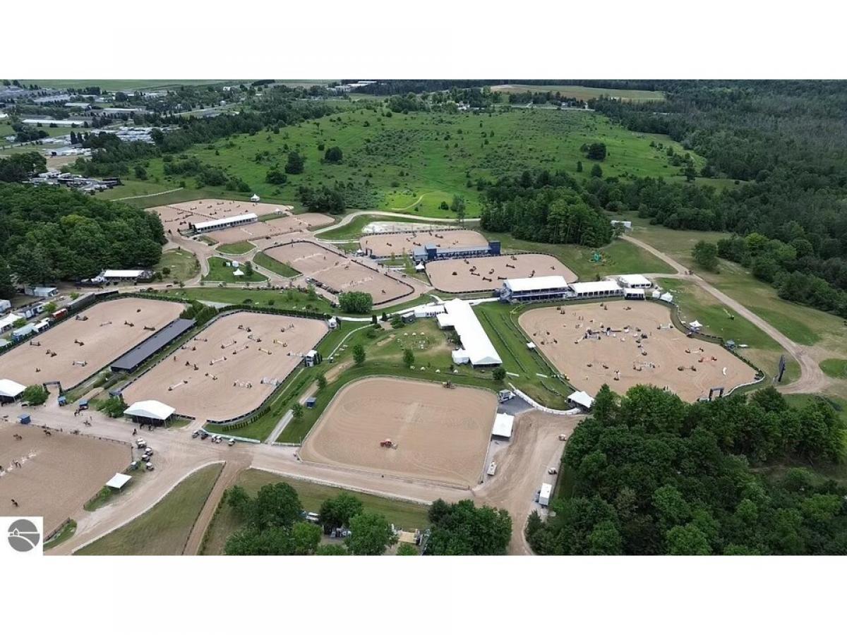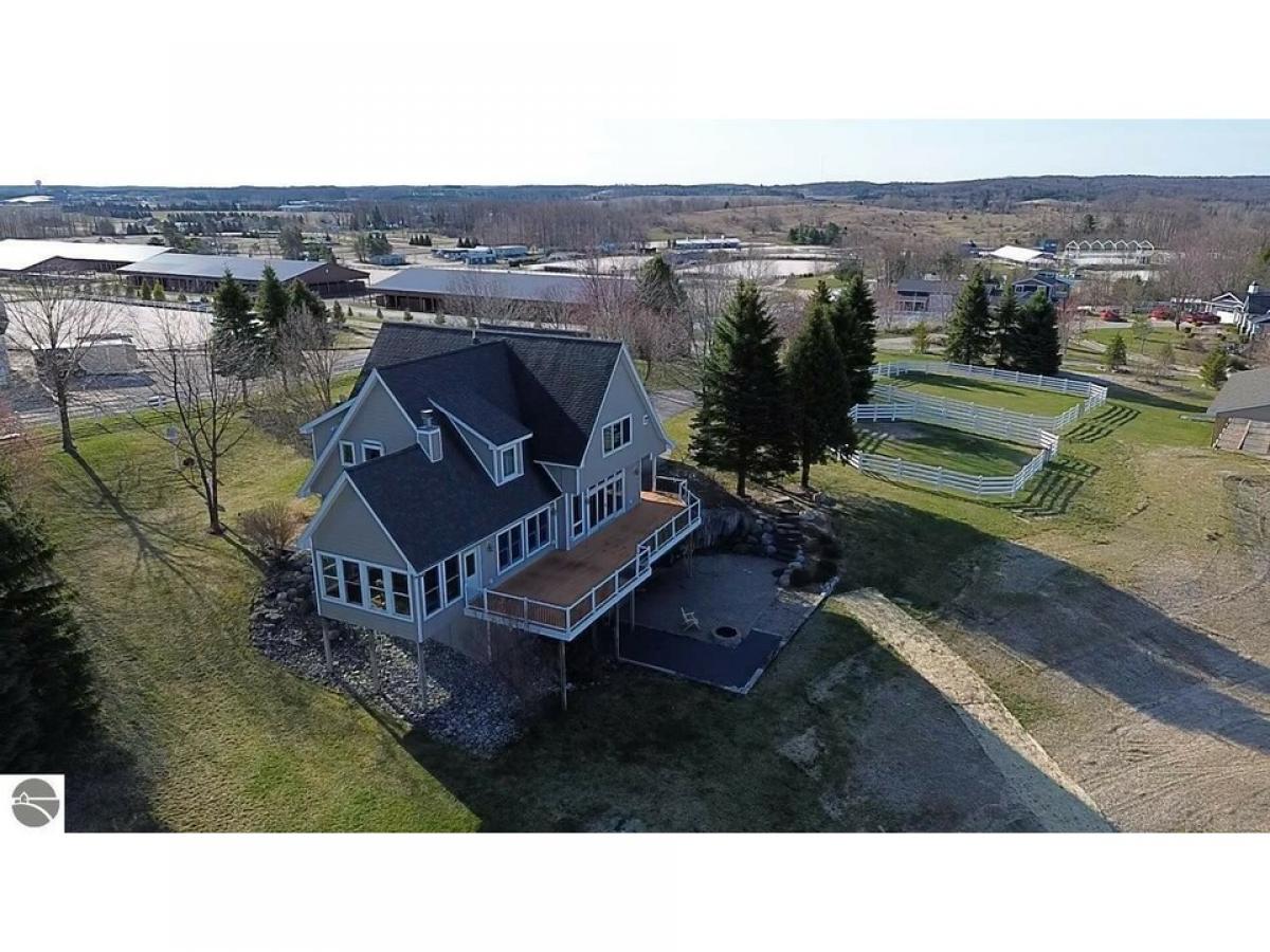 SPECTACULAR 5 ACRE SETTING situated on a private lane servicing only three homes in the heart of Flintfields and the Traverse City Horse Shows discover this newly listed estate. This luxurious offering for the equine enthusiast is ready to welcome you home. As you begin your tour you will discover impressive features throughout including expansive living spaces, Brazilian Cherry floors, hand chiseled slate floors and boasting 5 bedrooms, 3 ½ baths the possibilities are limitless. A well-appointed great room and dining room with a stone fireplace will be the indoor gathering place. A chef’s kitchen with professional style appliances, Subzero refrigerator/freezer, island with seating, gorgeous custom cabinetry, granite countertops; butler’s pantry and great views of the schooling ring. The light filled four season sunroom is great for curling up with a good book or the ideal “work from home” spot. The primary owner’s suite is enhanced by a fireplace, glorious views, washer/dryer combo and a soaking tub in the ensuite full bath. Walkout lower level with family room, fireplace, second kitchen, laundry room and more. Additional amenities include a 3-car garage, freshly painted interior, Geo Thermal HVAC system, immaculate and move in ready with most furnishings included. A wrap around deck will be a gathering place for your friends and family, relax on the brick patio or gather around the firepit to share stories. You will be impressed by the amazing views of the GT Peninsula and beyond. Equine features include a barn with 12 (10x12) stalls; 4 paddocks made of Amberline HDPE 4 rail fencing; plenty of room to build an arena and to add more paddocks and a second barn if desired. Equestrian Families, this is the opportunity you have been waiting for in northern Michigan, privacy, security and direct access to Flintfields with no roads to cross and just a short walk to the VIP tent.