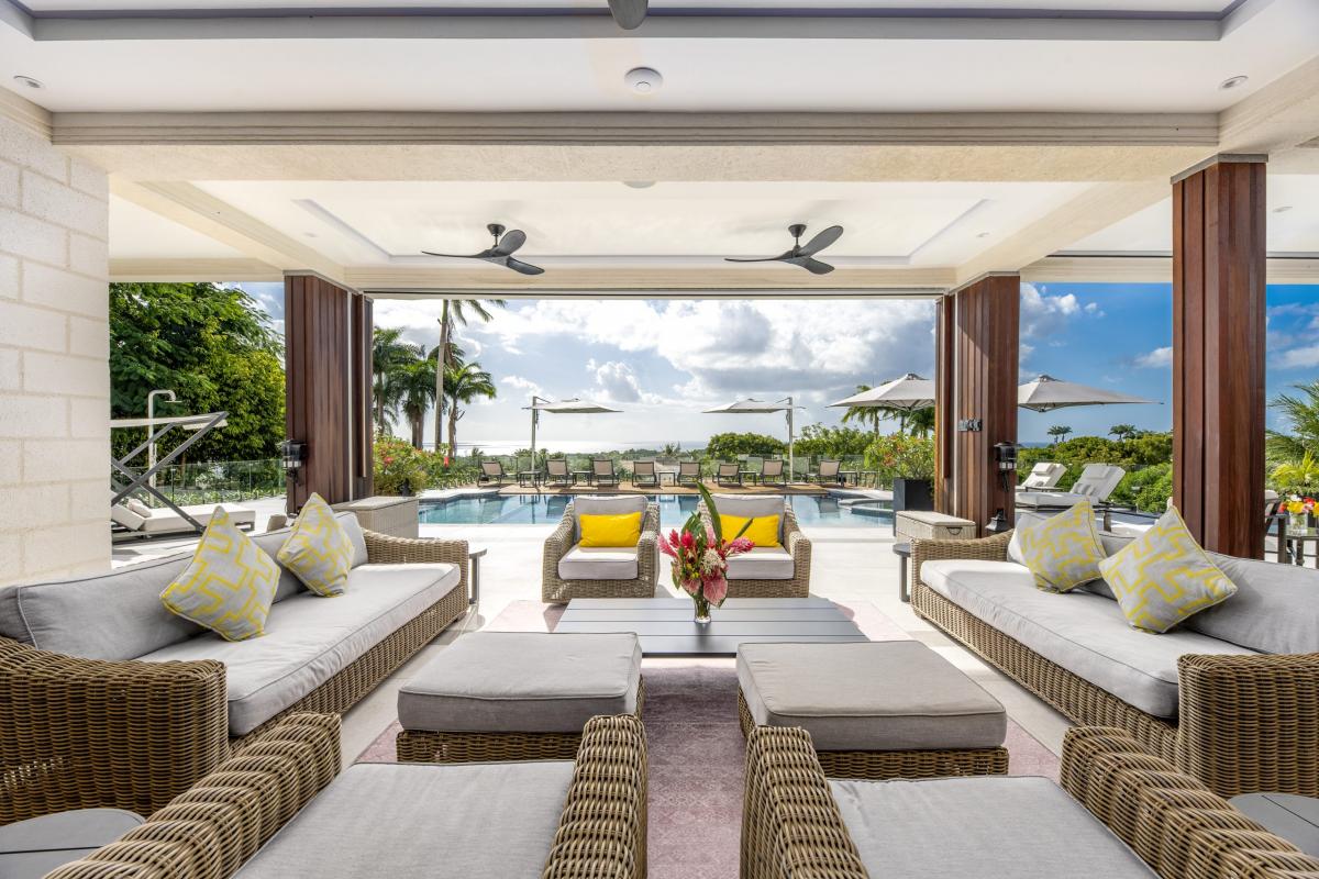 The main level features three meticulously appointed bedrooms, two of which offer breathtaking views of the sea. The third bedroom serves as a charming retreat for children and includes an enclosed shower as well as a bathtub. Upon ascending to the upper level, one will find an additional four bedrooms, inclusive of two master suites that access a shared private outdoor patio, creating an ideal environment for relaxation while enjoying the spectacular vistas.\r^\r^The modern kitchen is a culinary enthusiast's paradise, furnished with state-of-the-art appliances and sophisticated quartz countertops that enhance the cooking experience. The spacious living room provides an atmosphere of comfort and entertainment, equipped with an impressive 80-inch television. An expansive outdoor patio is designed for entertaining, featuring an al fresco dining area, stylish seating arrangements, and an outdoor kitchen equipped with a large barbecue grill and a full bar area.\r^\r^Guests can fully appreciate the enchanting beauty of west coast sunsets from the west-facing saltwater pool and heated spa. This thoughtfully designed residence incorporates a Sonos multi-zone audio system and an Ubiquiti multi-access point Wi-Fi network, ensuring seamless connectivity throughout the property. The exterior is enhanced with copper guttering and durable \u00be-inch cedar shingles on the roof, guaranteeing long-lasting quality.\r^\r^Additional conveniences include a two-car garage and buggy bay, as well as a small gym. The Royal Westmoreland Clubhouse is conveniently located a mere two-minute walk away. This property has been meticulously maintained and is fully furnished, allowing for immediate occupancy and enjoyment of the new home.