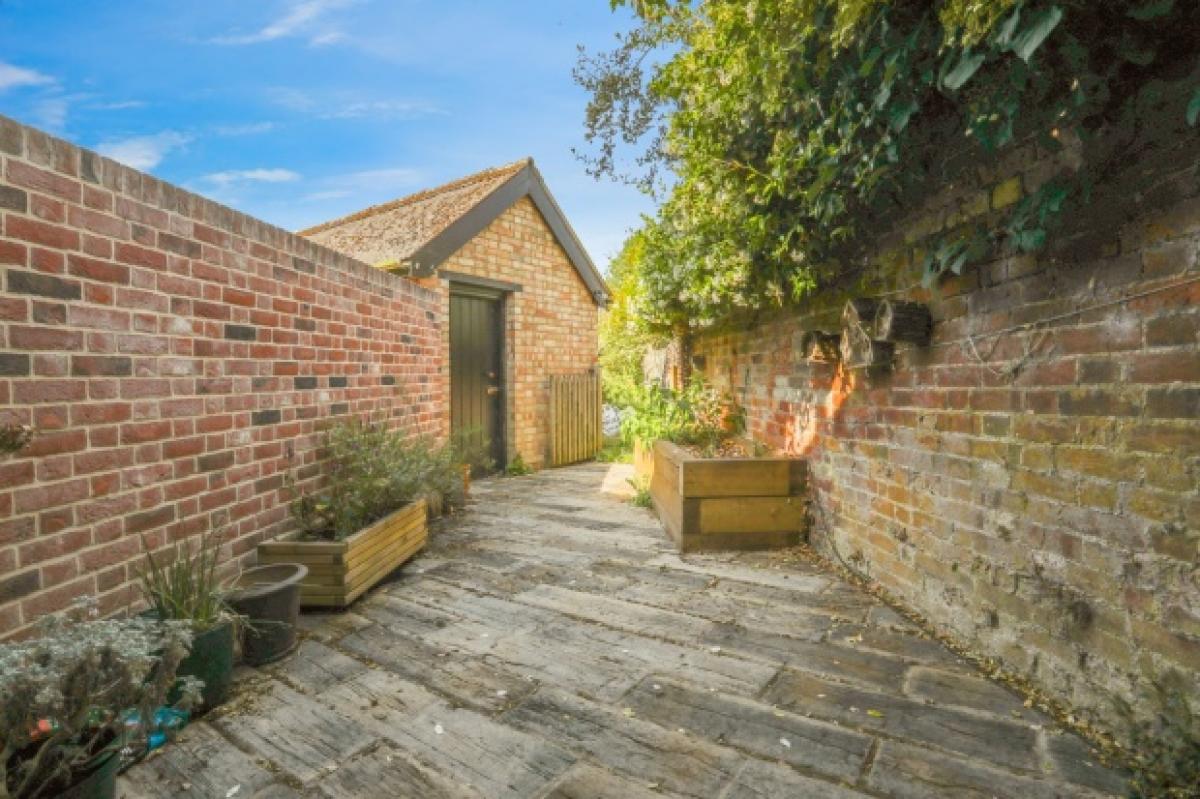 The garden lies across the shared gravel path and is a real feature - a low-maintenance haven with pebbles, a pond and waterfall, and even a little bridge that leads to a peaceful seating area. A shared parking area sits just beyond, with additional access from Mill Lane. At the rear, there's a charming courtyard, timber-edged and paved, with a gate to the back and a useful brick-built storage shed.