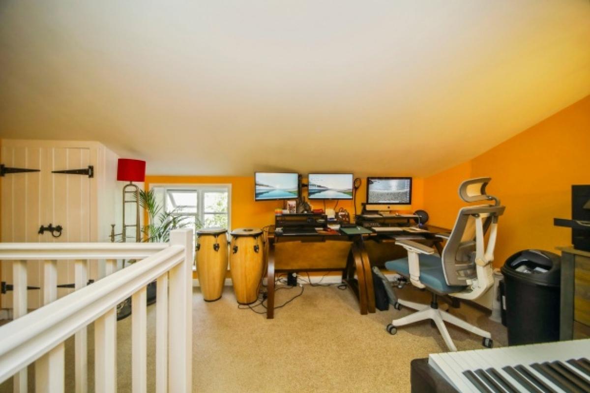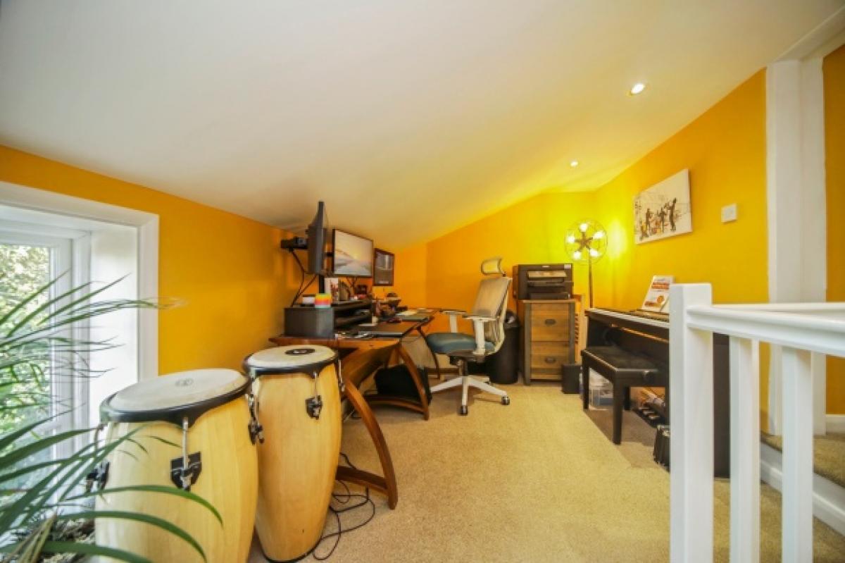 Also on the ground floor is a shower room with WC and a tiled cubicle, plus practical shelving and a window to the rear. Upstairs, the landing currently serves as a serene home office or occasional guest space, and leads to a spacious main bedroom with semi-vaulted ceiling and walk-in wardrobe.