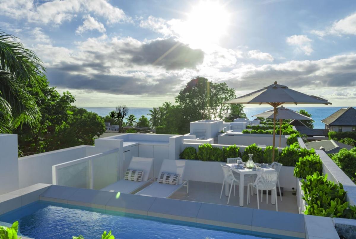 The highlight of this townhouse is the private rooftop terrace, where panoramic sea views meet a tranquil plunge pool, wet bar with drinks fridge, and dining for four – the perfect setting for sunset cocktails or starlit dinners. Surrounded by tropical landscaping, this outdoor haven captures the essence of refined island living.