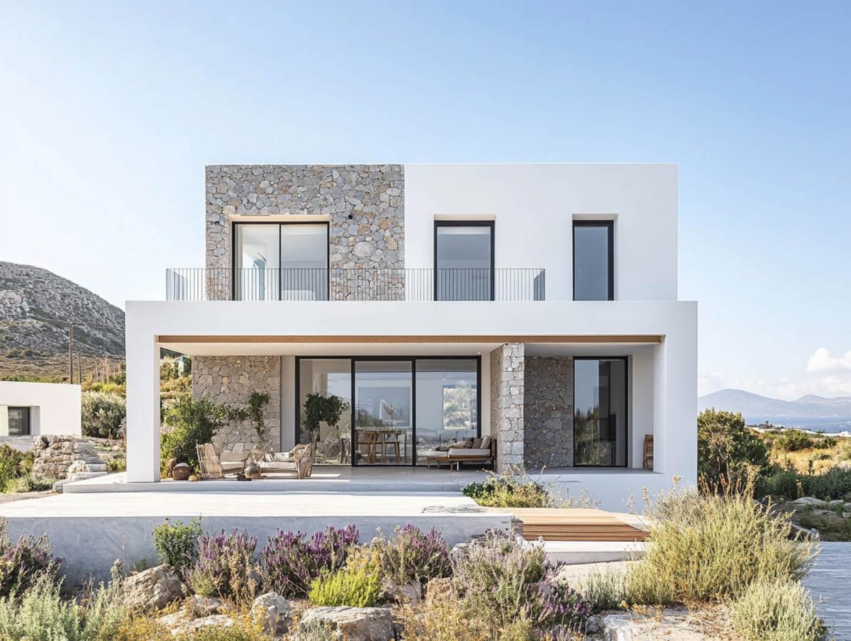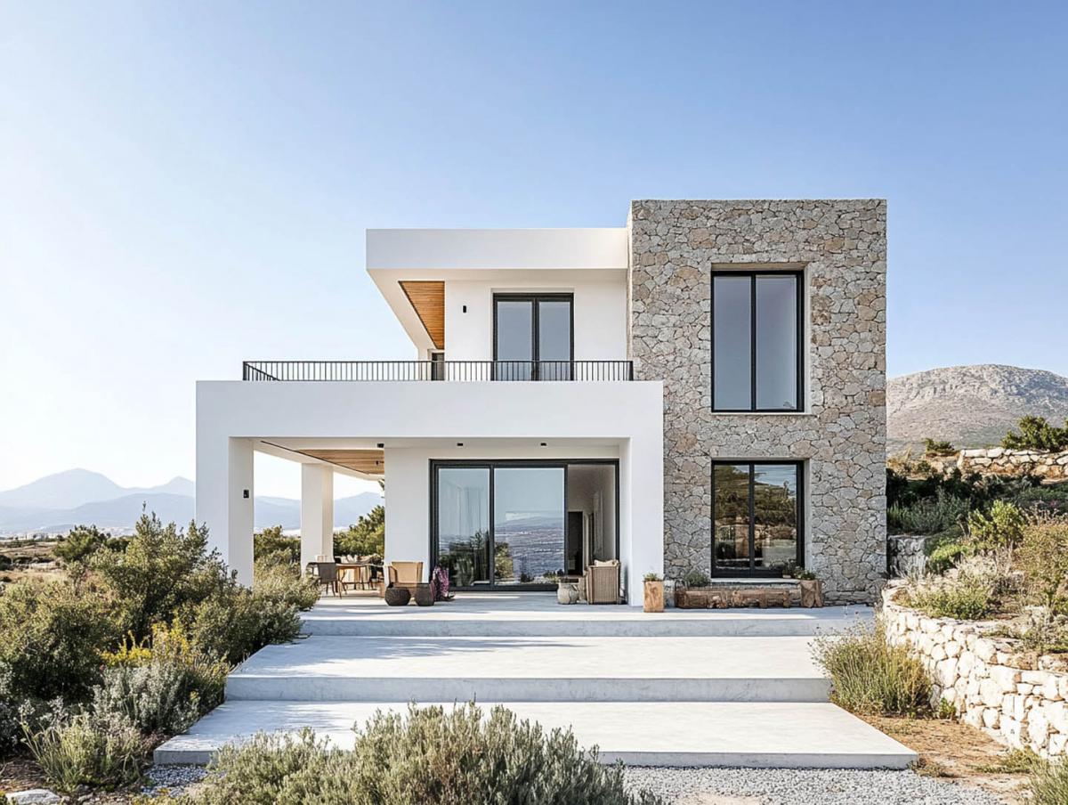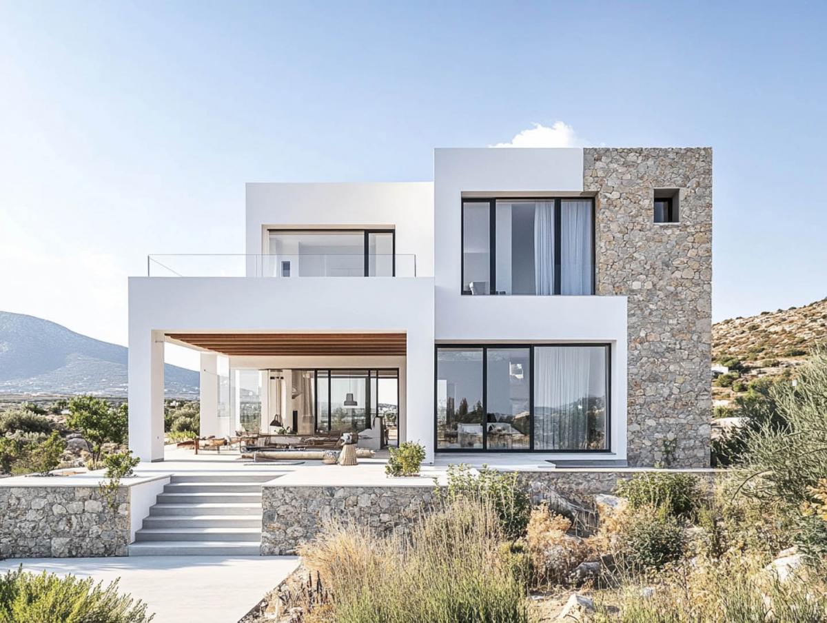 There's no ostentation here—just a refined rhythm of light and shadow, the contrast of smooth plaster and rugged stonework, and glass walls that open the home to air and distant views. This architecture doesn't compete with nature; it complements it, like a tailored suit that supports the silhouette—unobtrusive but precise.