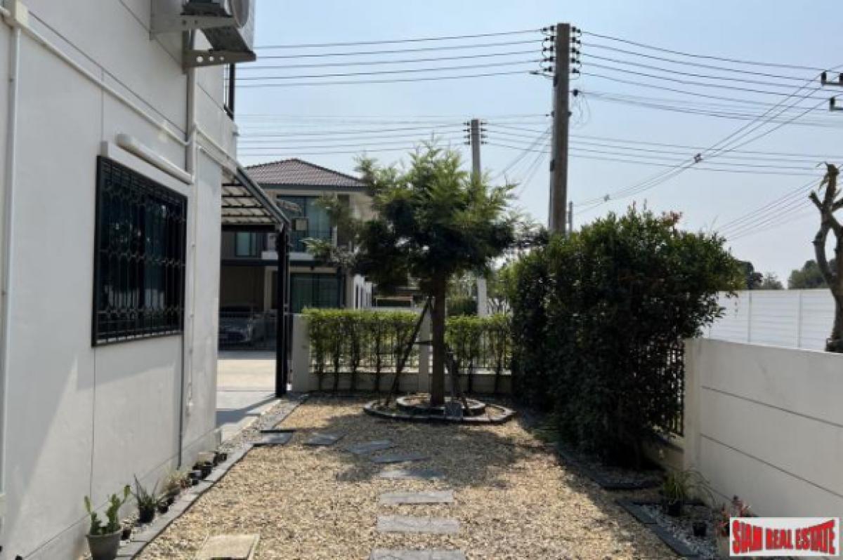 New Modern Single House, with 2 floors - 3 bedroom, 3 baths, 1 living room, 1 complete western style kitchen with full length island, 1 laundry room with washer/dryer, 2 parking spaces with extended roof and tile floor, CCTV 5 camera system around the house, 1 garden storage house, spacious stone garden with footpath-Private Moo Baan that is quiet for families
