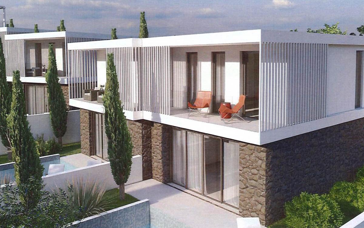Each villa in the development boasts its own private swimming pool, perfect for cooling off during hot Cyprus summers. The outdoor spaces are thoughtfully landscaped with Mediterranean plants, including tall cypress trees that add vertical interest and privacy between the properties.