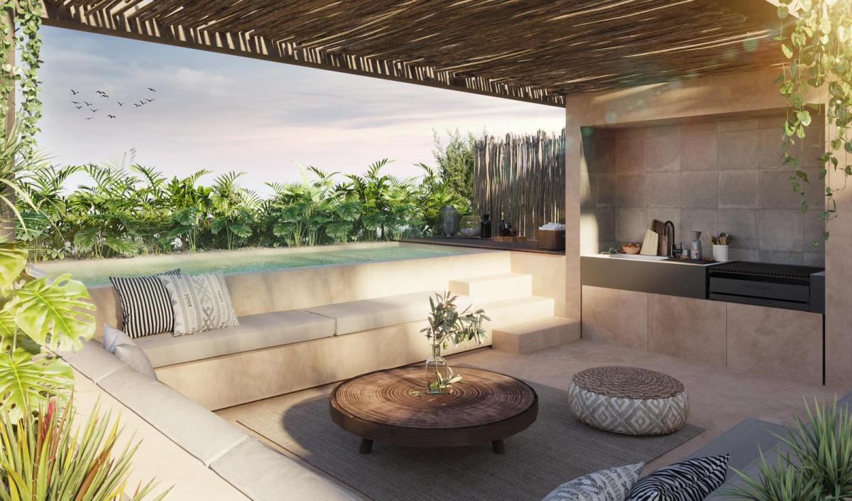 Discover a rare opportunity to own a truly expansive residence in the heart of Tulum's most vibrant neighborhood. This exceptional townhouse offers a generous 292 square meters (approximately 3,143 square feet) of meticulously designed living space spread across four levels, providing an unparalleled sense of volume and privacy. The home features three spacious bedrooms, including a master suite with a private terrace, and is complemented by multiple full and half bathrooms, ensuring comfort and convenience for both residents and guests. Every level is thoughtfully crafted to foster connection while offering intimate retreats, making it an ideal sanctuary for those who value both community and solitude.The residence is a masterpiece of sustainable luxury, featuring high-end finishes that blend seamlessly with eco-conscious technology. The ground floor welcomes you with an open-plan layout integrating the living, dining, and a fully equipped kitchen, all flowing into a private garden. Ascend to discover the tranquil bedrooms, a practical laundry area, and finally, the crown jewel: a spectacular rooftop oasis complete with a private pool, pergola, lounge area, and built-in barbecue—perfect for entertaining while enjoying breathtaking views. Features such as cross ventilation, strategic solar gain, a biodigestor, and a water catchment system ensure a comfortable, low-impact lifestyle without compromising on modern luxuries.