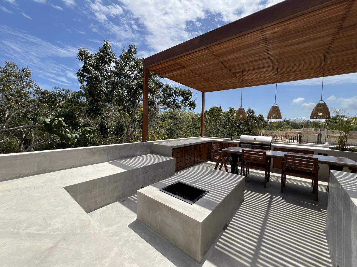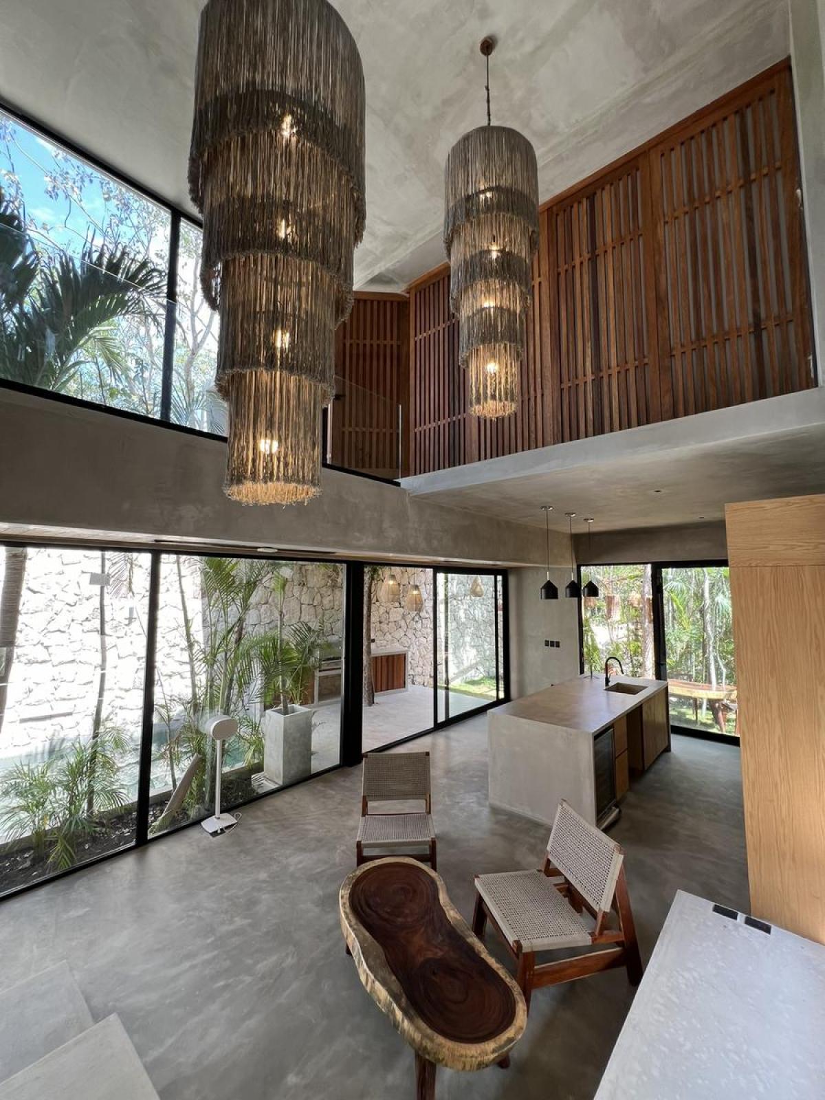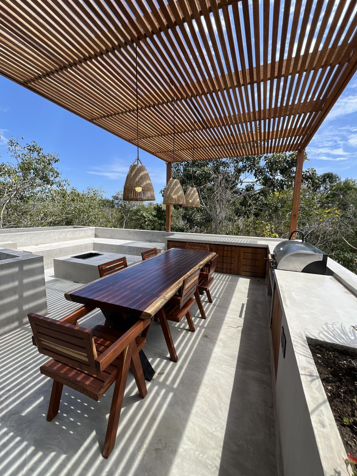Imagine a contemporary villa where sustainable luxury and the Mayan jungle merge to create a unique living experience in the heart of Tulum. This exceptional property offers 223.82 square meters of construction, approximately 2,409 square feet, intelligently distributed on a 218.65-square-meter lot that preserves native vegetation. The residence features three spacious bedrooms, each designed as a rest sanctuary, and three full bathrooms plus a half-bath, guaranteeing absolute privacy and comfort for residents and guests. The spaces have been meticulously planned to maximize connection with nature, with large windows framing panoramic jungle views and allowing an flood of natural light.The heart of this villa is a fluid indoor-outdoor living concept, where a gourmet kitchen with European BLUM technology and a central island integrates seamlessly with the living and dining room, creating the ideal setting for entertainment. This seamless flow continues outdoors through a covered terrace with a dining area and grill, leading to a refreshing private pool surrounded by a sun deck. The rooftop constitutes a true social oasis, with a bar, BBQ area, fire pit, and lounge space, offering spectacular views of the Mayan jungle treetops, the perfect place to enjoy magical sunsets.
