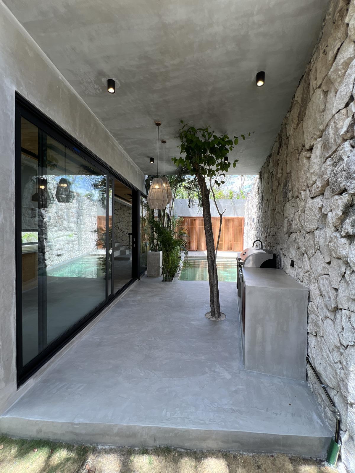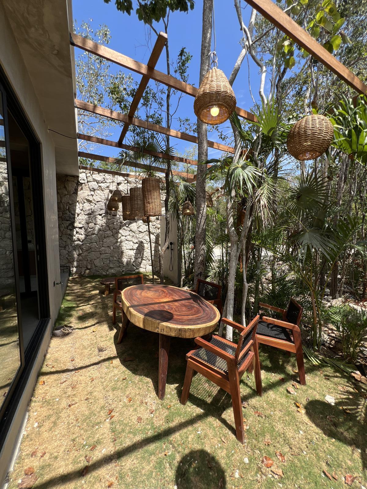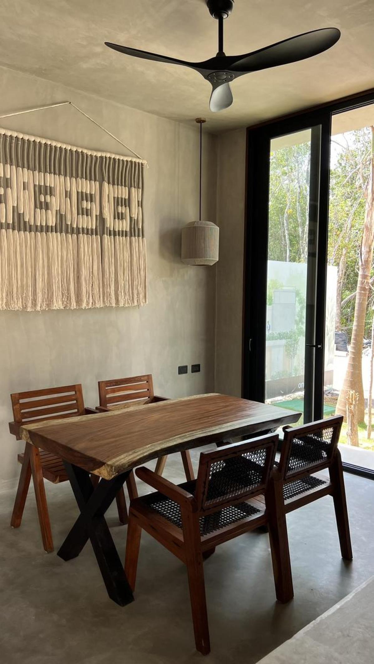 Imagine a contemporary villa where sustainable luxury and the Mayan jungle merge to create a unique living experience in the heart of Tulum. This exceptional property offers 223.82 square meters of construction, approximately 2,409 square feet, intelligently distributed on a 218.65-square-meter lot that preserves native vegetation. The residence features three spacious bedrooms, each designed as a rest sanctuary, and three full bathrooms plus a half-bath, guaranteeing absolute privacy and comfort for residents and guests. The spaces have been meticulously planned to maximize connection with nature, with large windows framing panoramic jungle views and allowing an flood of natural light.The heart of this villa is a fluid indoor-outdoor living concept, where a gourmet kitchen with European BLUM technology and a central island integrates seamlessly with the living and dining room, creating the ideal setting for entertainment. This seamless flow continues outdoors through a covered terrace with a dining area and grill, leading to a refreshing private pool surrounded by a sun deck. The rooftop constitutes a true social oasis, with a bar, BBQ area, fire pit, and lounge space, offering spectacular views of the Mayan jungle treetops, the perfect place to enjoy magical sunsets.