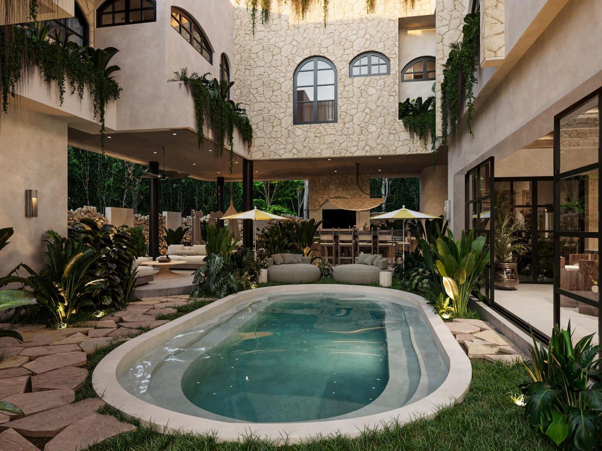 Imagine an architectural masterpiece where Zen philosophy merges with contemporary luxury to create an unparalleled living experience in the heart of Tulum. This spectacular 648-square-meter villa, approximately 6,976 square feet, unfolds majestically on a 500-square-meter corner lot, offering an intelligent distribution between 397 square meters of refined interior spaces and 217 square meters of meticulously designed outdoor areas. The property features six luxurious bedrooms, each with its own private bathroom to ensure absolute comfort, with capacity to comfortably host up to 16 guests, ideal for retreats, family gatherings, or exclusive escapes with friends. The spaces have been curated to evoke a sense of grandeur through refined simplicity, where every architectural element celebrates proportion, natural light, and spiritual connection with the surrounding jungle.The heart of this residence is a stunning triple-height living room that serves as an architectural centerpiece, crowned by a sculptural staircase that becomes a functional work of art, creating a spatial experience that is both inspiring and deeply serene. The seamless flow continues to a refined dining area and a fully equipped kitchen with premium appliances that integrates effortlessly with a covered terrace ideal for al fresco gatherings, barbecues, and game nights, framed by lush private gardens. The outdoor focal point is a generous main pool accompanied by a private wellness area with cold plunge tub and jacuzzi, creating a rejuvenation sanctuary in the privacy of your own paradisiacal patio.