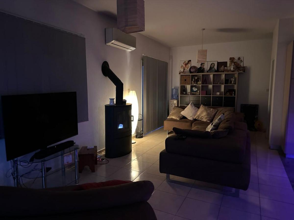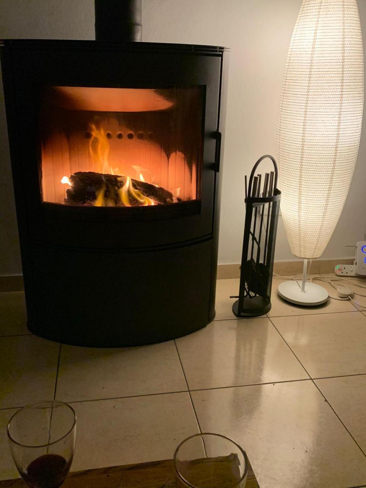 The central focal point of the living room is a wood-burning stove, perfect for cozy winter evenings, complemented by central heating that warms the entire house.