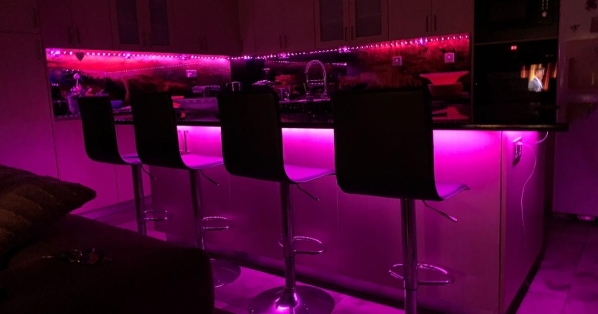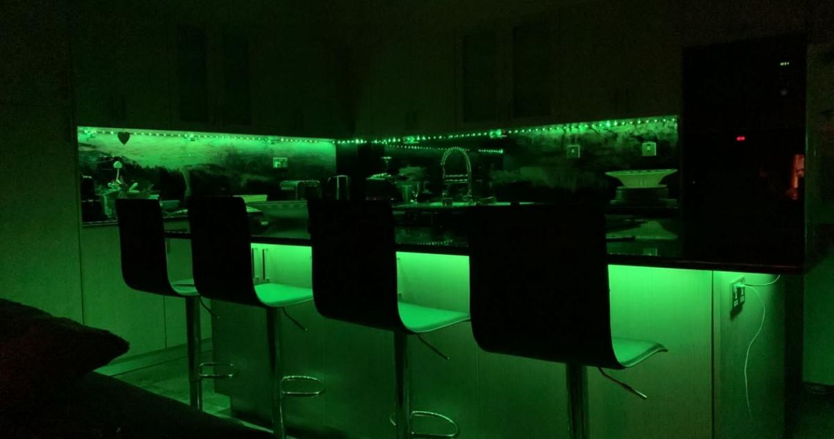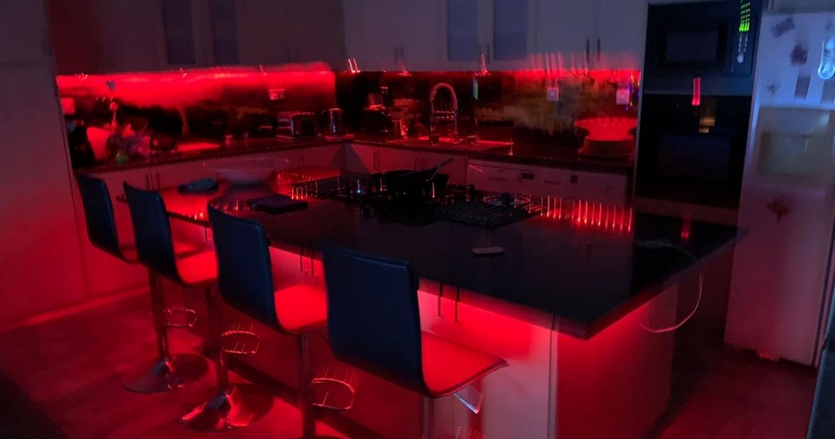 The warm wooden tones of the kitchen cabinets are both stunning and practical, while the 'graphic pattern' backsplash adds a delightful contrast to the overall aesthetic. Additionally, the kitchen island is equipped with advanced lighting systems, including color-changing LED strips that create a romantic evening ambiance. Spacious and functional, this kitchen is truly the heart of the home - perfect for family gatherings or preparing something special.