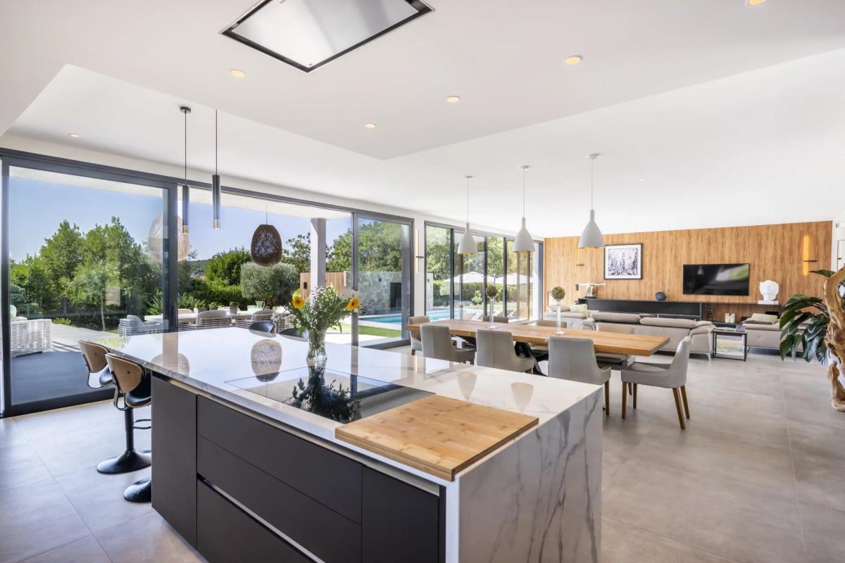 Located near Valbonne, this recently built luxury villa embodies elegance and modern comfort. Designed with high-quality materials, it offers an exceptional living environment, combining contemporary design and generous space. The villa consists of several levels, including a large, bright living room, an open kitchen equipped to the highest standards, and a dining room. Each space benefits from natural light thanks to large bay windows, which offer a breathtaking view of the landscaped garden and swimming pool.