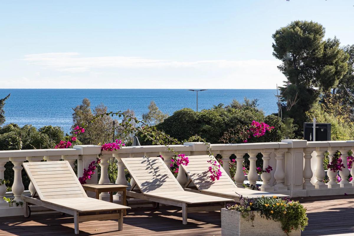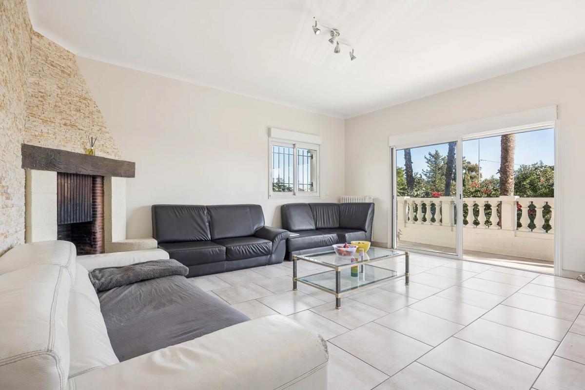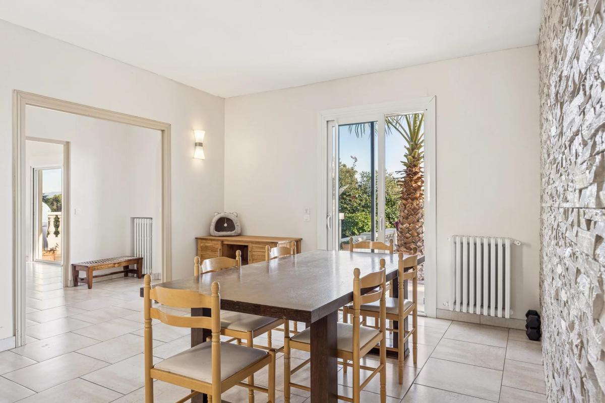 At the gateway to Super Cannes, this elegant villa of over 200 sqm enjoys a panoramic sea view and is nestled within a beautifully landscaped 1,237 sqm garden filled with exotic plants and flowers.