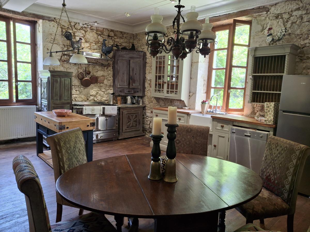 Magnificent Period Manor House with Pool and Much Mor located at the end of a quiet path, in a peaceful and very private setting, magnificent 310m2 stone house consisting of a large living room, kitchen, pantry, 7 bedrooms, office, 3 shower rooms, 3 toilets; 78m2 guest house with a large living room and 1 bedroom with shower room. Oil central heating. 2 septic tanks.7m x 14m heated chlorine swimming pool, "pigeonnier", old barn all on 10 acres of land with a well.