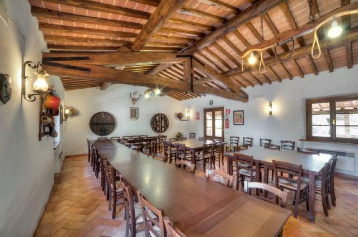 The ground floor features a spacious living room with a fireplace, a second lounge, a large eat-in kitchen, and a bathroom. On the first floor, you'll find four bedrooms, two bathrooms, and a large terrace with breathtaking panoramic views of the Tuscan hills.