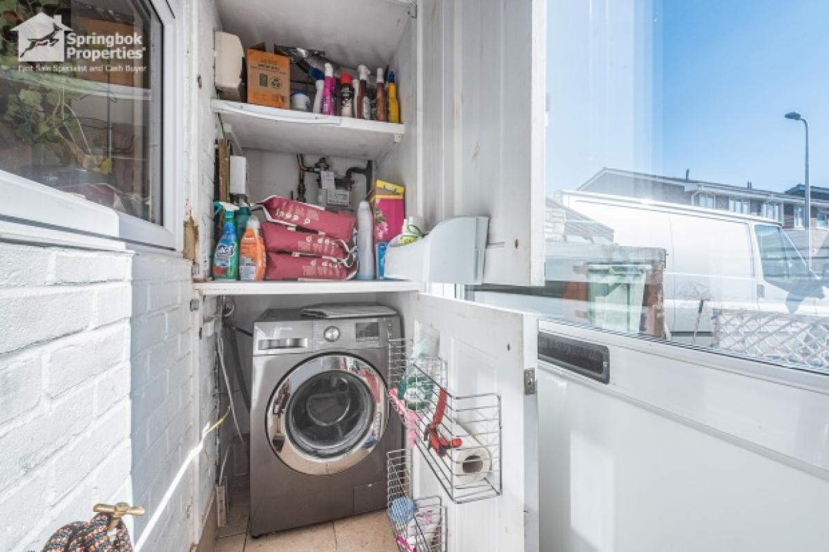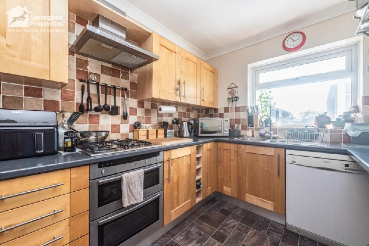 To the rear, the sitting room flows naturally into a conservatory, opening onto the garden and providing flexible living space. The front kitchen is arranged with a worktop and cupboard storage, creating an efficient and functional environment for meal preparation.