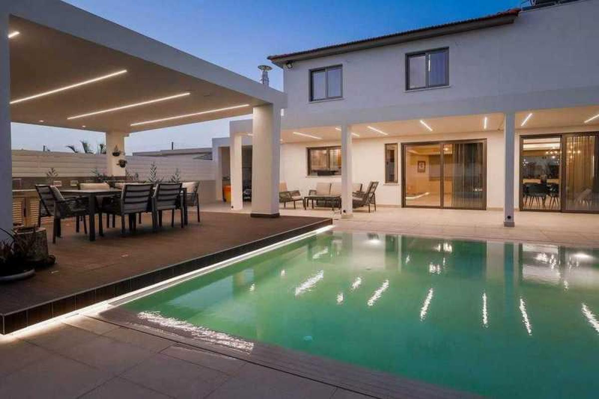 This impressive luxurious detached house in Xylofagou, Larnaca is situated in a peaceful residential area. The property offers a well-designed and versatile living space, surrounded by beautifully landscaped gardens and bordering a green area, ensuring excellent views and an abundance of natural light.The house is finished with top-quality materials and boasts a ground floor featuring a spacious and bright living area, a generous dining room, a large TV room, a well-appointed kitchen complete with electrical appliances and a breakfast area. There is also a practical laundry room, and a guest WC. A noteworthy eco-friendly fireplace graces the ground floor, adding warmth and charm to the space.