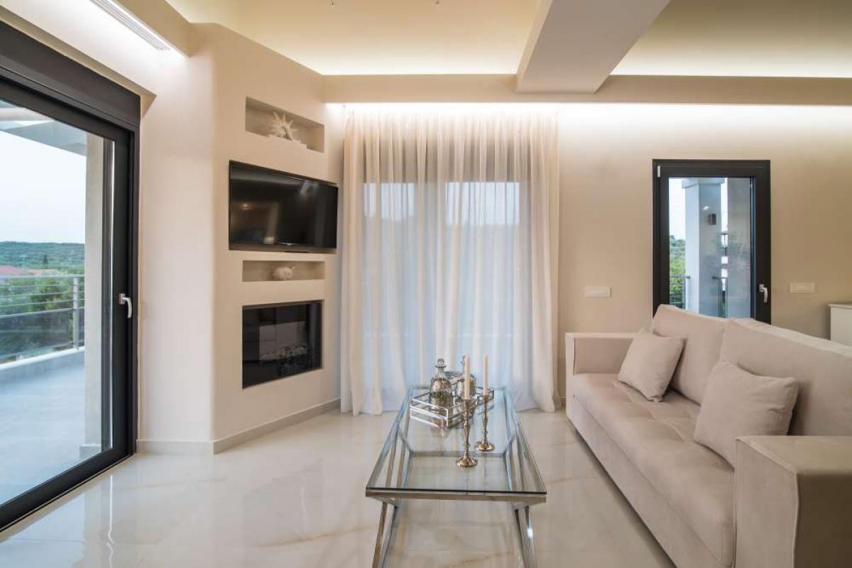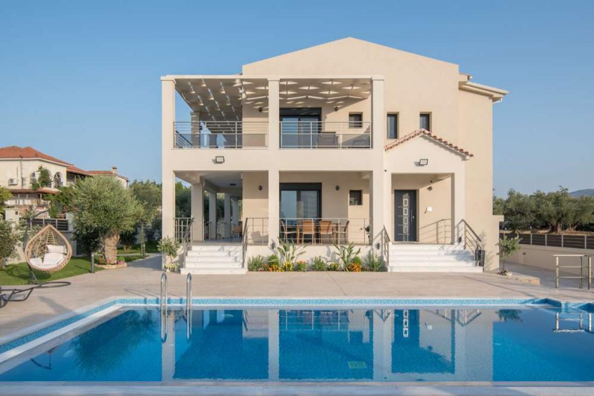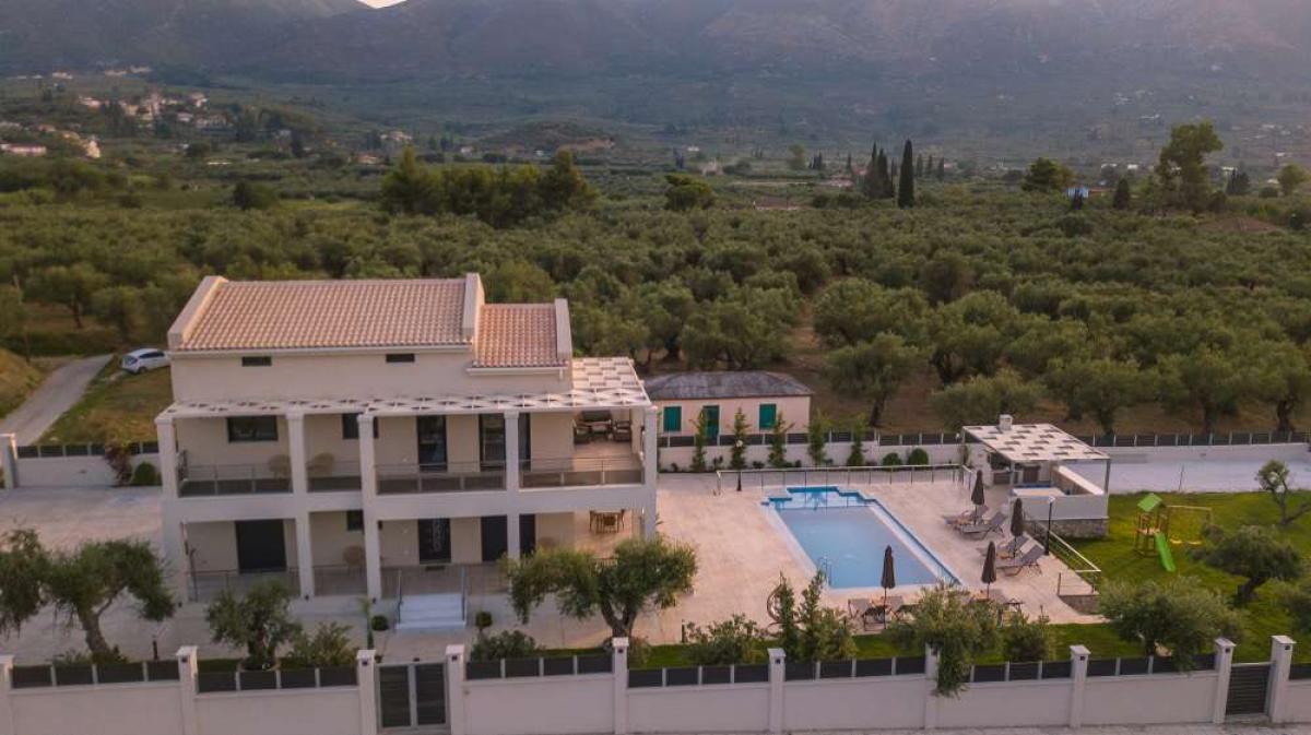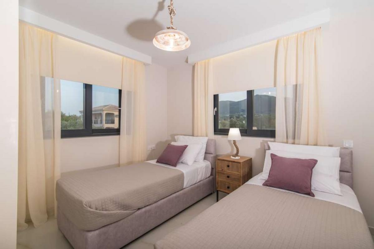 Zakynthos. Luxurious, fully equipped, newly built villa 270sqm with pool, 4 km from the sea, for sale. The villa consists of 2 separate houses that each includes 4 bedrooms, 4 bathrooms, kitchen, living room and terraces overlooking the garden and the sea. It has a wonderful view of the mountains, is fully furnished and has a total of 8 bedrooms, 8 bathrooms, 2 kitchens, 2 living rooms. It also has security doors, solar water heaters for hot water, fireplace, air conditioning, swimming pool, parking, garden 1.500sqm, grass, barbecue, garage, autonomous heating, alarm, storage. Distances: 4km from the sea and 10km from the airport and 9km from Zakynthos town.Price: €1.500.000