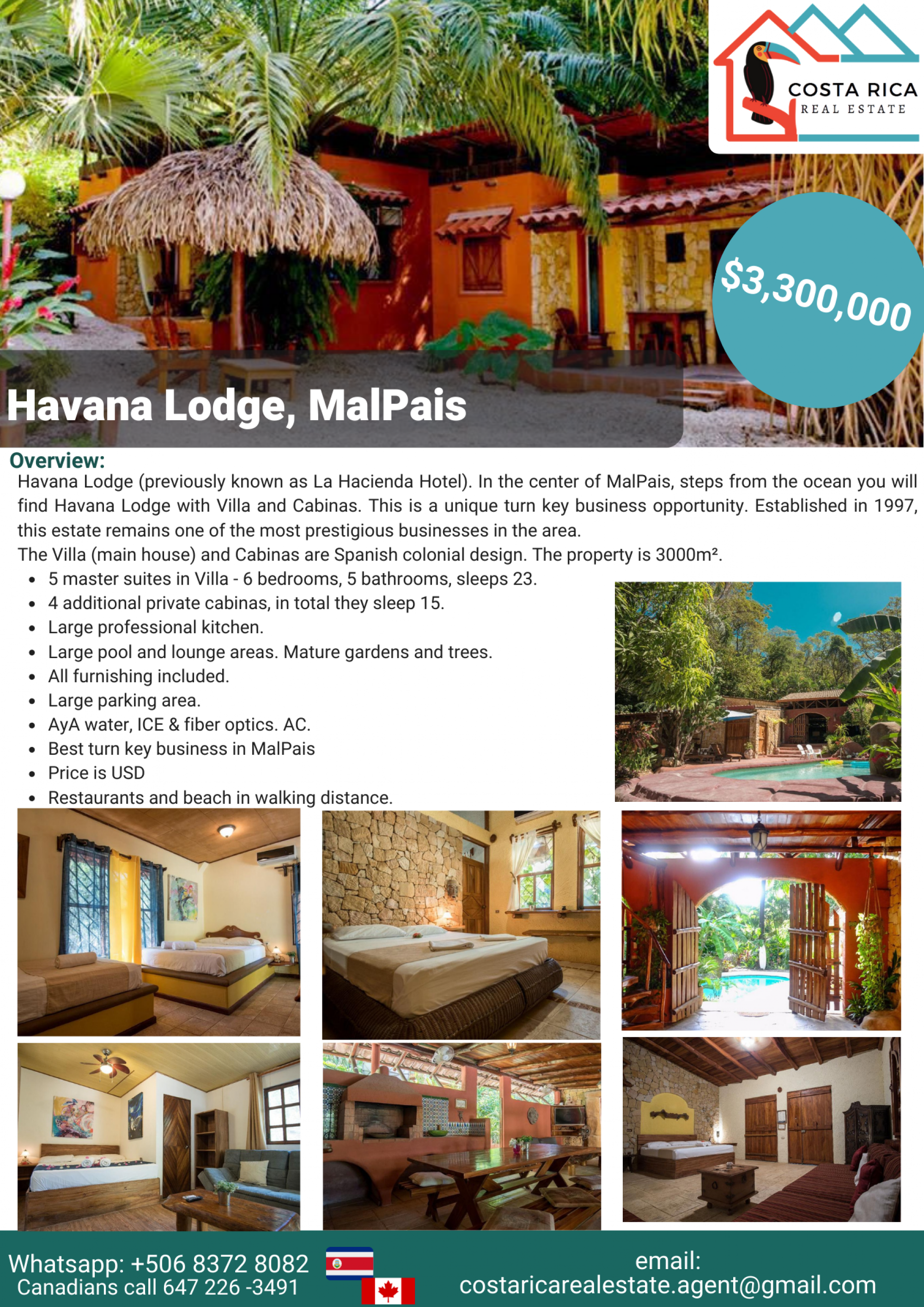 Havana Lodge (previously known as La Hacienda Hotel). The property is 3000m². Price $3,300,000 USD. In the center of MalPais, steps from the ocean, you will find Havana Lodge with a Villa and Cabinas. This is a unique turn key business opportunity. Established in 1997, this estate remains one of the most prestigious businesses in the area. The Villa (main house) and Cabinas are Spanish colonial design. 5 master suites in the Villa - 6 bedrooms, 5 bathrooms, sleeps 23. Suitable for groups. 4 additional private cabinas, in total they sleep 15. Suitable for families. Large professional kitchen and living room for use by all guests. Large pool and lounge areas. Mature gardens and trees. All furnishings included. Large parking area. AyA water, ICE & fiber optics. AC. Best turn key business in MalPais Restaurants and beach in walking distance. Website https://www.costarica-realestate.coemail: costaricarealestate.agent@gmail.com