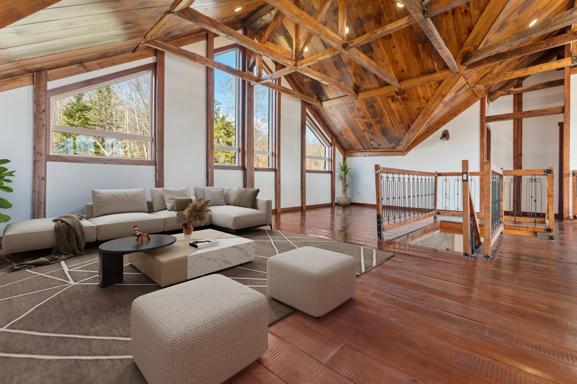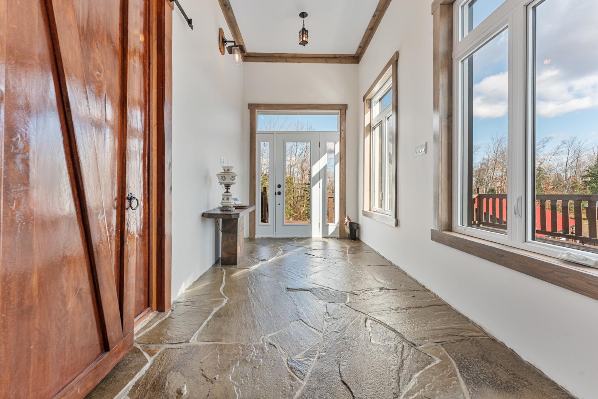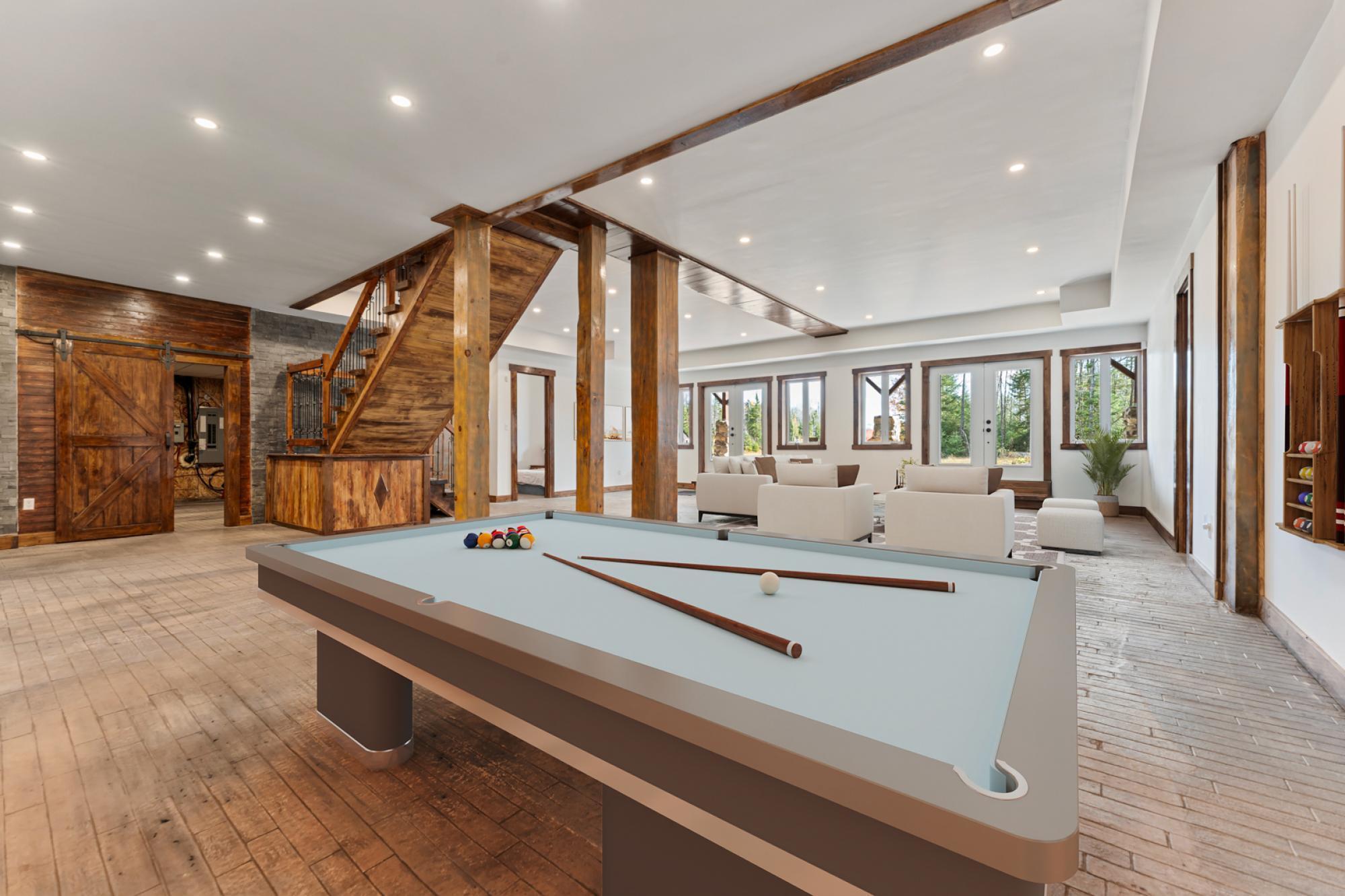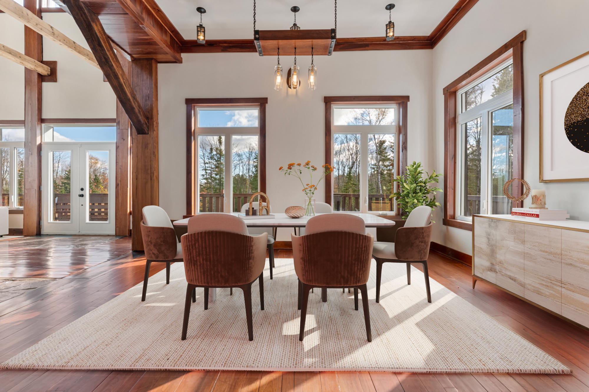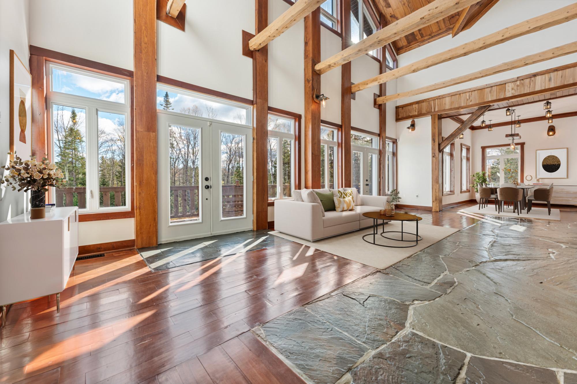 The moment you cross the threshold, the air itself changes. The scent of wood fills the space -- a blend of pine, cedar, and cherry that wraps the home in an authentic, comforting warmth. Light pours through the vast windows, gliding across the floors, catching the textures of stone, and illuminating the richness of natural materials. The space breathes. Your gaze lifts, captivated by the soaring volumes, the massive beams, the interplay of shadow and light.