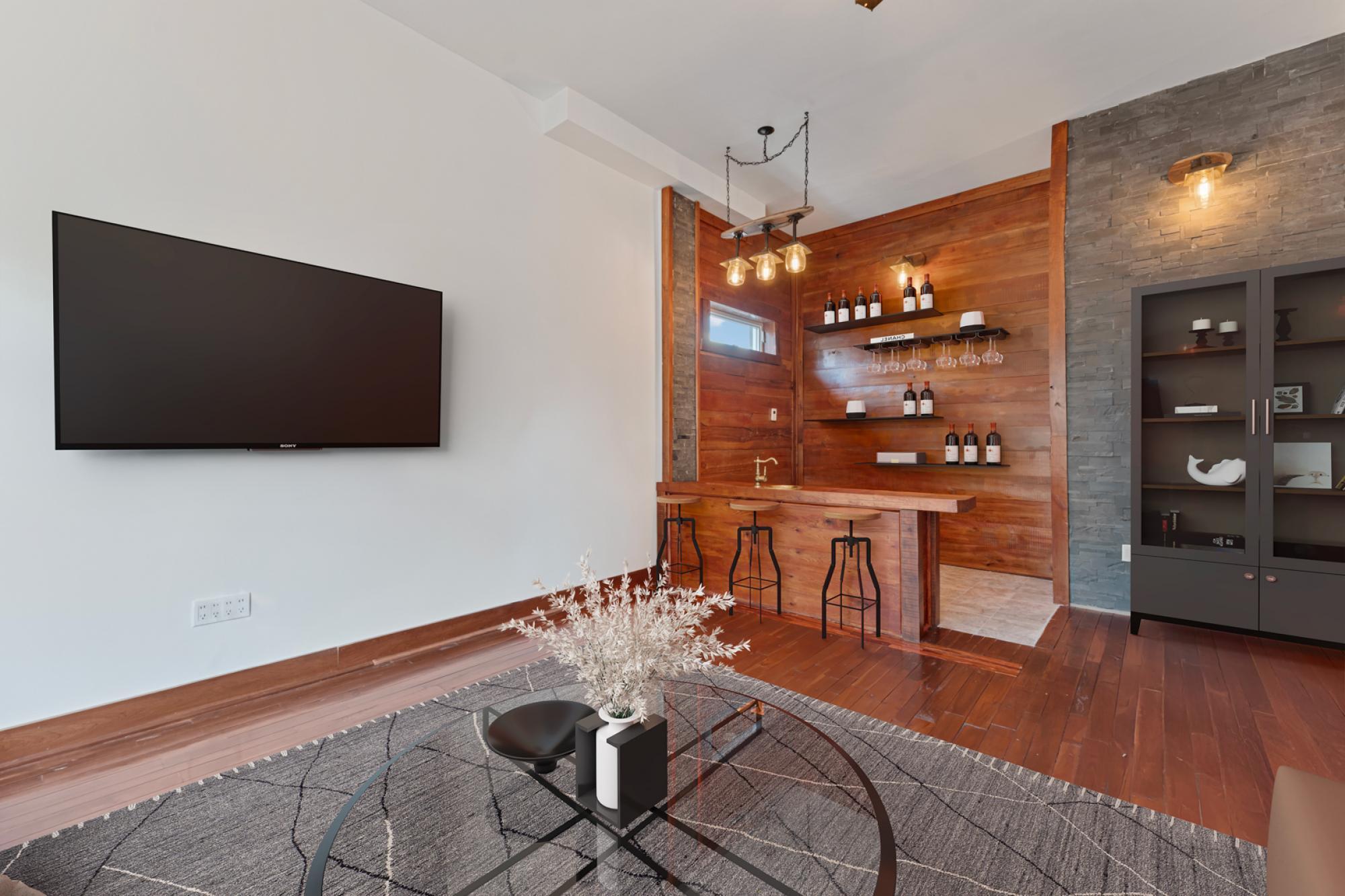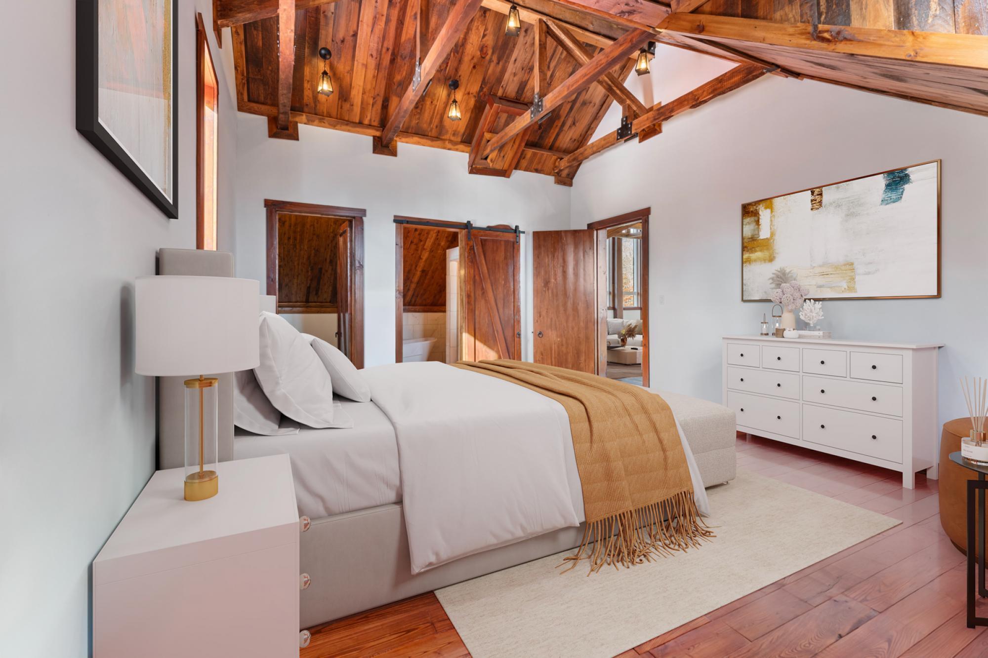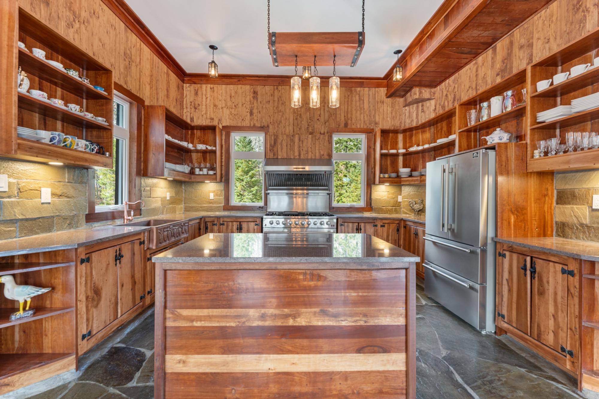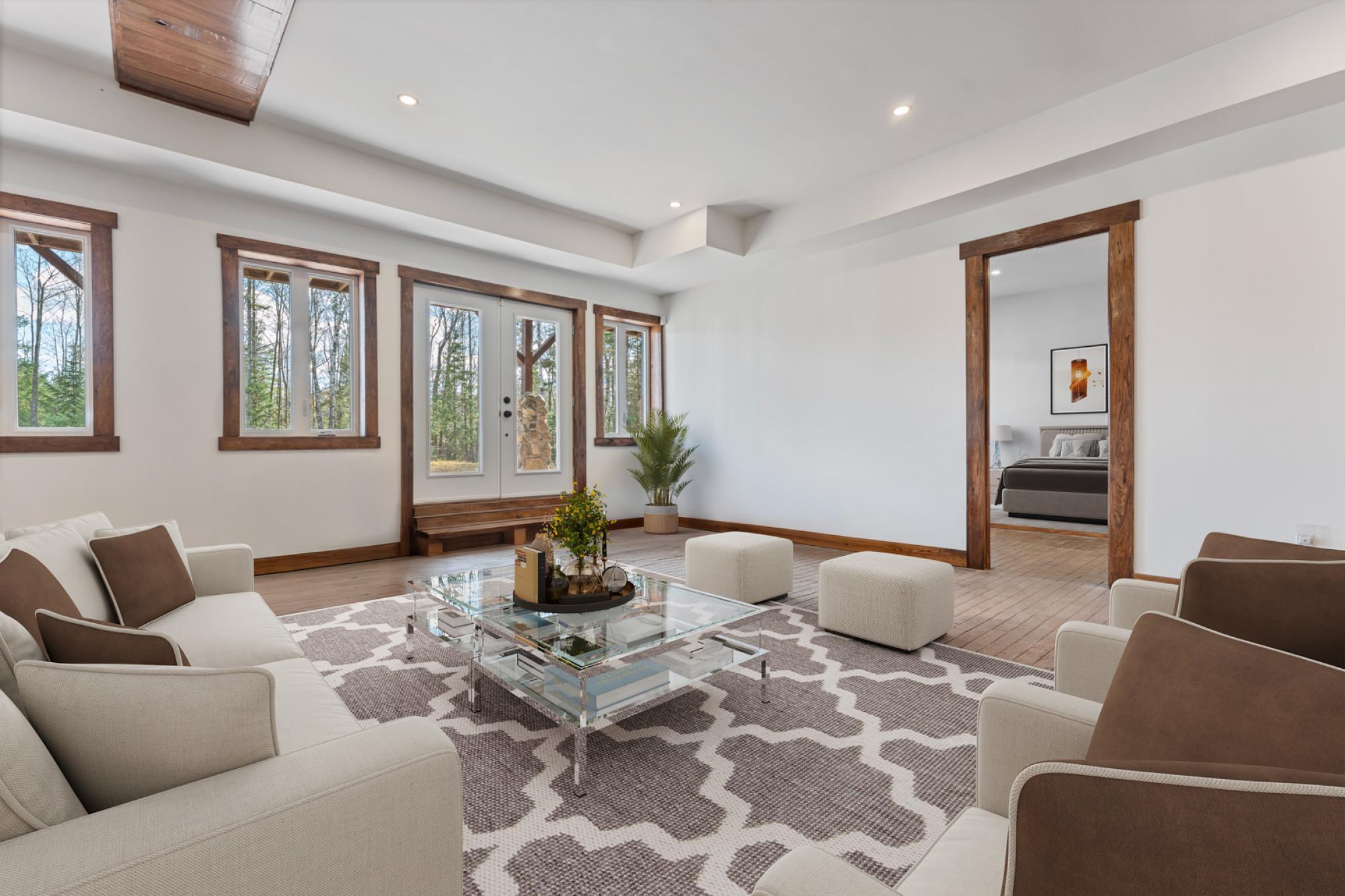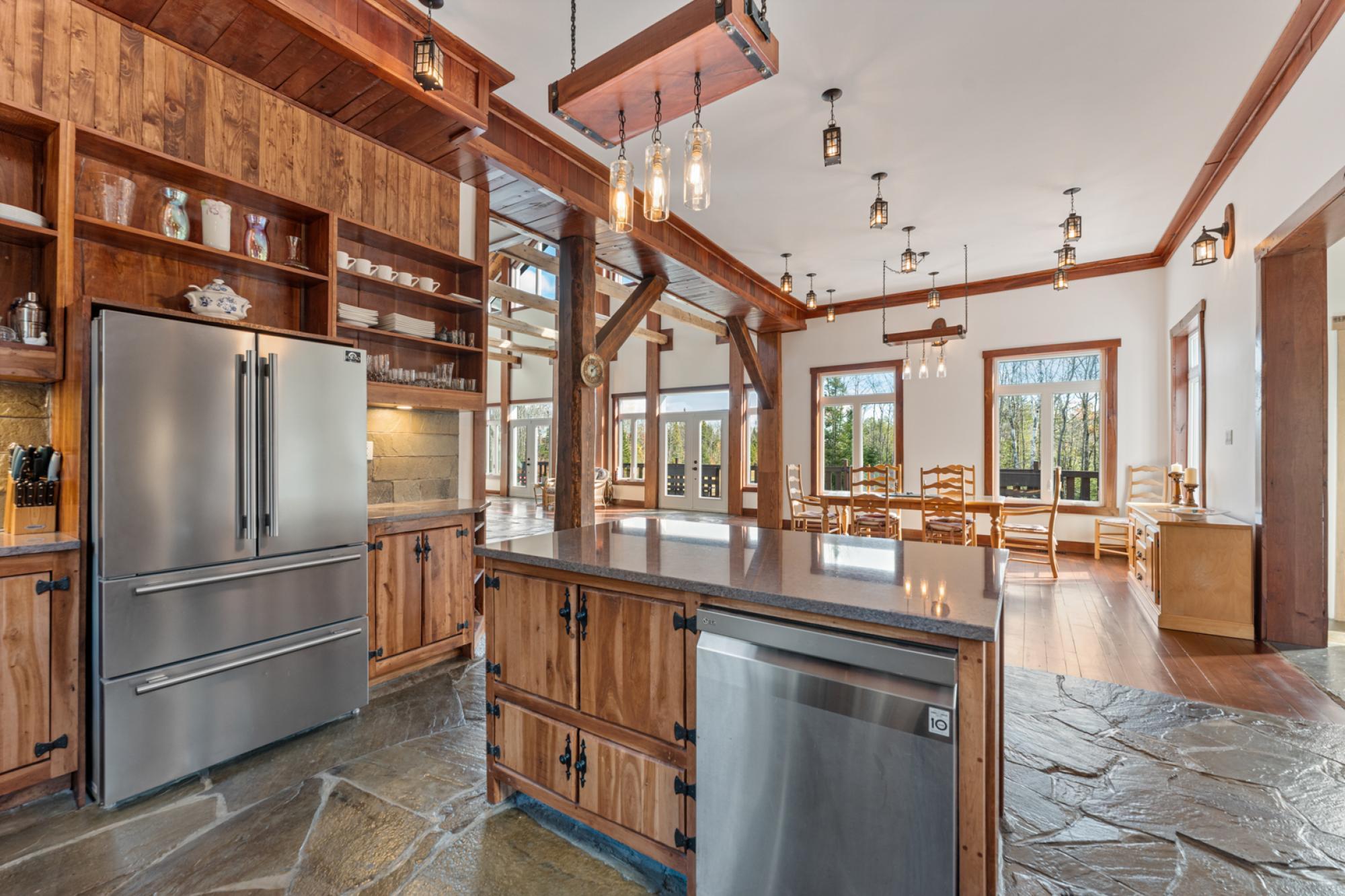 The moment you cross the threshold, the air itself changes. The scent of wood fills the space -- a blend of pine, cedar, and cherry that wraps the home in an authentic, comforting warmth. Light pours through the vast windows, gliding across the floors, catching the textures of stone, and illuminating the richness of natural materials. The space breathes. Your gaze lifts, captivated by the soaring volumes, the massive beams, the interplay of shadow and light.