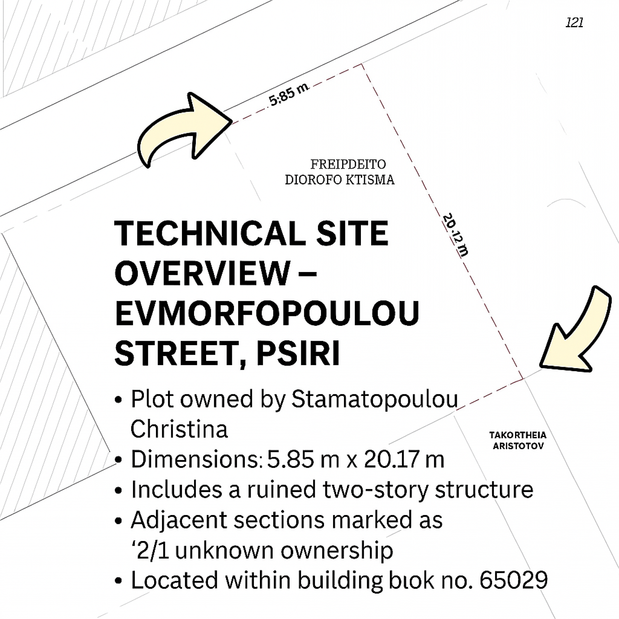 LIKE A POSTCARD FORGOTTEN IN TIMEIn the heart of old Athens, in Psiri on Evmorfopoulou Street-a street where time seems to have stood still- there is a unique 113 sq.m plot for sale, with a building coefficient of 2,( buildable up to 226sq.m) plus 100sq. m for common areas staircase, elevator, storage rooms etc.