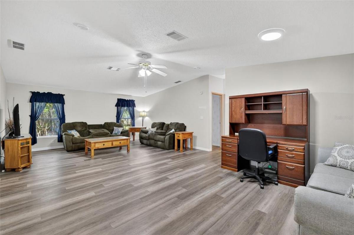 Situated in the Fox Run 55+ community, this 3-bedroom 2-bath home with 1,568 SF of interior living area offers a very functional and flexible split floor plan, all centered around its great room, which separates the primary suite from the second and third bedrooms, enhancing your privacy. Newly installed vinyl plank flooring, volume ceilings, skylights, and plenty of windows add to the open feel of the home. The formal dining area located across from the great room can be used for an additional living area or a hobby/office space. The kitchen, with its ample cabinets, large pantry, and counter space, flows seamlessly into the front dining area, offering great views of the outdoors through the front screened porch. The oversize driveway has plenty of room for company parking as well as your golf cart. At the back of the carport, you can relax in the shaded patio area while you watch your pet enjoy the outside in the fenced and private backyard. Fox Run 55+ community offers a busy social calendar centered around its clubhouse and two pools. Whether you enjoy walks in the neighborhood or on the boardwalk, or fishing from the dock, with access to the "Harris Chain of Lakes" from its marina and boat ramp, you can also enjoy a day on the water fishing or cruising. Call today to schedule your private showing, so you too can enjoy the Fox Run Lifestyle.