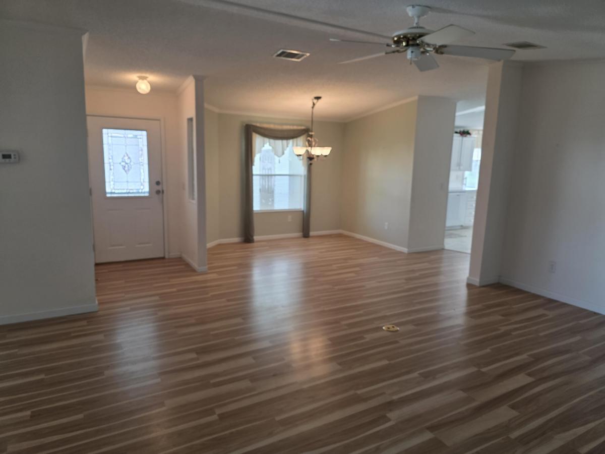 Land Owned! The perfect retirement home. Three bedrooms, two bath located right on a lake. Peaceful views and gorgeous sunsets. Large lanai with windows and screens with an outdoor concrete patio. Great for a Bar-B-Q's or just lounging with your favorite beverage. Good size kitchen with plenty of counter space and lots of cabinets. Cute breakfast nook with a view of the lake. Entertaiment size living room with attached dining area, both with laminate floors. King size master suite, bath has a large dual sink vanity, tub/shower combo. Two guest bedrooms another full bath. One bedroom could be used as a den or office. Large storage shed at end of carport and two car driveway. Located in Fabulous Savanna Club. Resort style 55+ community.