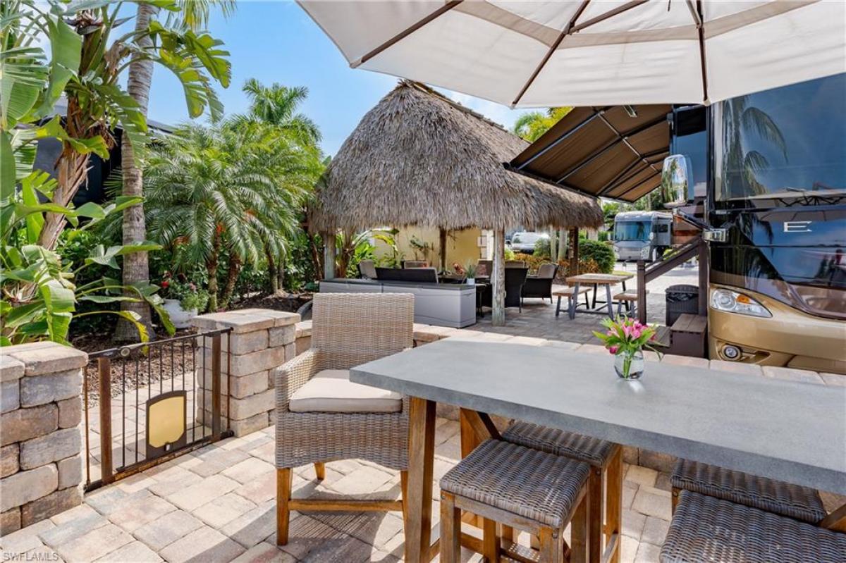 Lot 173 - You pull into the richly landscaped gated Class A Motorcoach Resort, you marvel at the entrance fountains as you pull up to the gates. You are now facing a larger fountain that fronts the beautiful club house, also richly landscaped. You make the turn and go around the lake till you get to your new home away from home. You make the right into your fully paved circular drive site, again richly landscaped. To your right you see your fully air conditioned casita with huge living space and a large bathroom. Next to your amazing casita is a huge tiki with plenty of seating for friends and family. But wait.... there's more! As you move towards the coach wait.... two more seating areas, and one of them is in a fully enclosed with gate seating area with front row seats to the lake and fountain! Perfect area to keep your pet with you while you sit and enjoy the fountain. This location on the lake give you a direct lake view which on the far end of you lake you see the man made beach that backs up to the infinity pool and clubhouse. Truly one of the best views! This oversized lot accommodates all of this plus a 45 foot coach, a vehicle and a golf cart with entertaining room galore. This property is an absolute must see... Naples Motorcoach Resort is a Class A only resort and boasts a beautiful infinity pool, hot spa, exercise room, men and ladies' saunas and a kitchen that owners can use. A clubhouse for events whether sponsored by the resort or you can reserve for your own gathering. Two satellite pools each with a hot spa their own rest rooms and a laundry room. We can't forget your furry best friend; the resort also has a dog park!