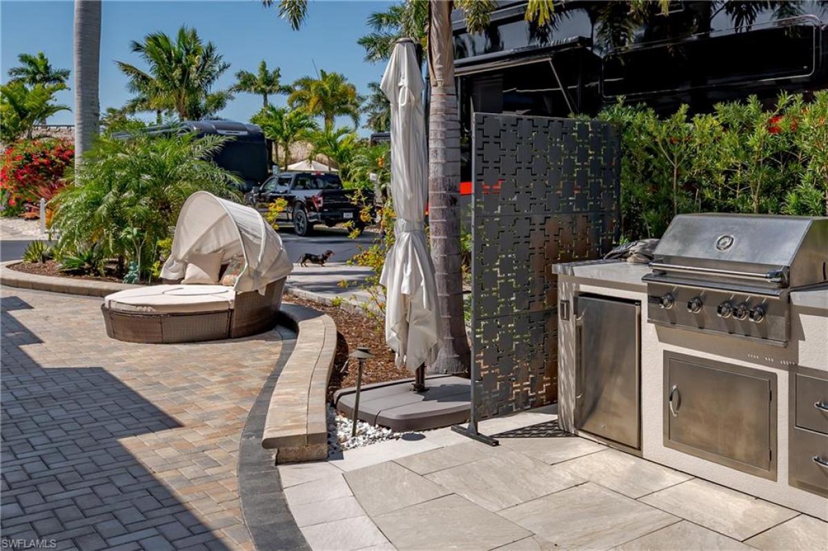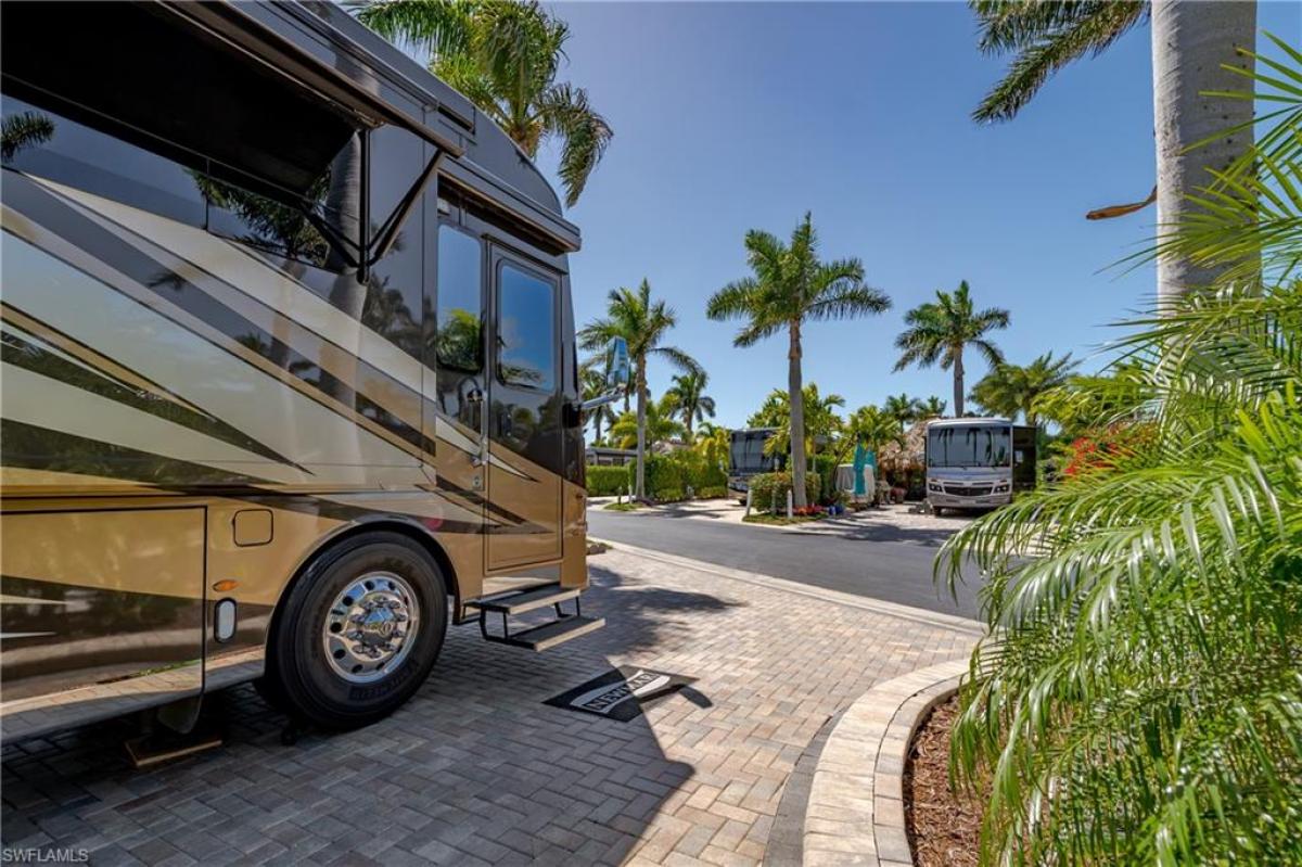 Lot 104 - You drive through the gates after admiring the beautiful flower and Royal Palm lined entry. As the gates swing open you are now facing a magnificent fountain in front of the clubhouse. You now turn and head to your slice of paradise, once again you cannot believe how beautiful this road is lined with Royal Palms... As you back into your beautiful fully paved lot, you admire the beautiful formal landscaping on your property. Now that you are settled in, you head back to your oversized tiki you decide to sit and relax with the beverage of your choice You plan to have dinner outside at your dining table tonight and listen to the water from your fountain. You have your own outdoor custom kitchen with both hot and cold water! You create a wonderful meal on your barbeque and thoroughly enjoy it at your table. You are so happy to be in paradise and enjoying your turn-key property. What shall you do tomorrow?? Perhaps take one of the community kayaks and launch from the boat ramp and go through Rookery Bay. Maybe you will buy a boat, how convenient would that be to launch and go to the beach or boat up to a restaurant for lunch or dinner from within the resort? Perhaps it is time to learn how to play pickleball and play on one of the three courts? Probably best to build up those muscles first in the fitness center and then sit in the sauna. So many options! Welcome to the magic that is Naples Motorcoach Resort. Naples Motorcoach Resort is a Class A only resort and boasts a beautiful infinity pool, hot spa, exercise room, men's and ladies saunas as well as a catering kitchen that owners can use. There are also two satellite pools with a hot spa, their own rest rooms and a laundry room. We can't forget your furry best friend, the resort even has a dog park! Special note to investors, looking for a place to invest or reinvest as a 1031 exchange? Look no further, own this piece of paradise and put it into the management run rental program. The rental program administration advertises, schedules renters, collects payment including applicable taxes/fees and sends you your portion. These deeded lots are mortgage eligible and great for a quick close.