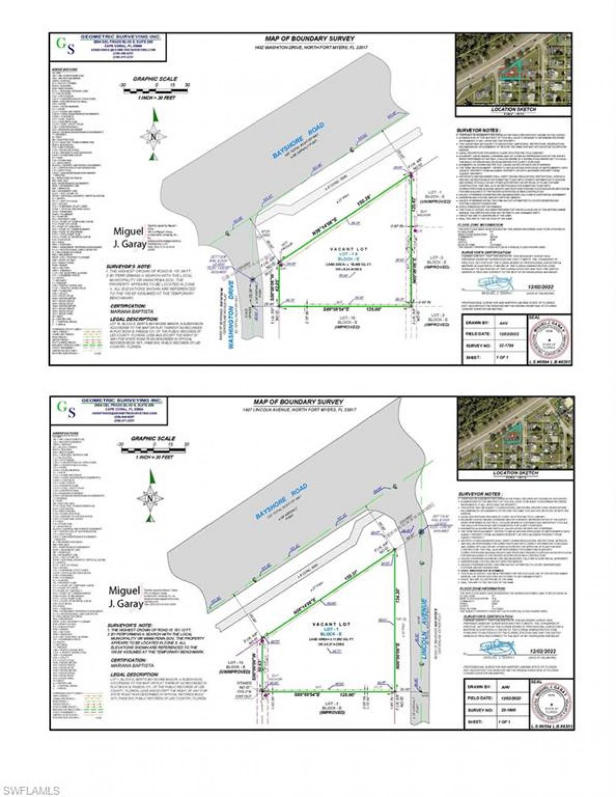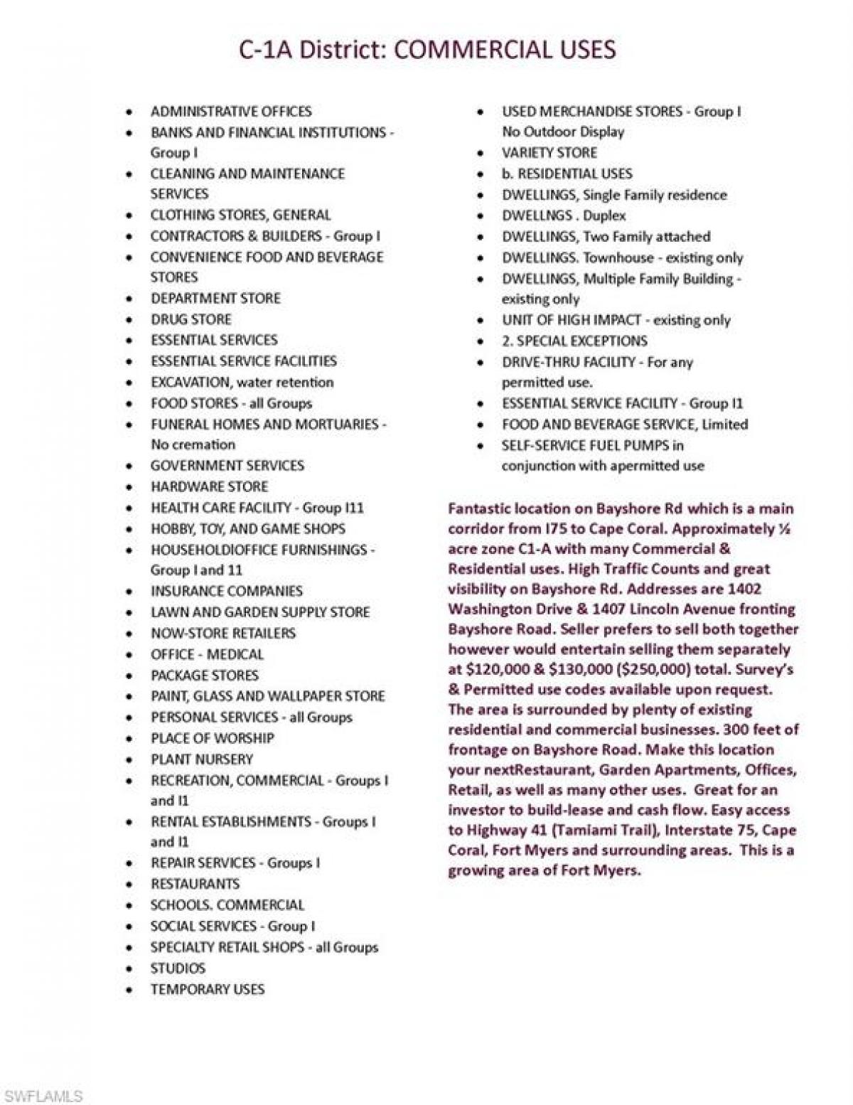 Fantastic location on Bayshore Rd which is a main corridor from I75 to Cape Coral. Approximately ½ acre zone C1-A with many Commercial & Residential uses. High Traffic Counts and great visibility on Bayshore Rd. Addresses are 1402 Washington Drive & 1407 Lincoln Avenue fronting Bayshore Road. Seller prefers to sell both together however would entertain selling them separately at $99,000 & $100,000 ($199,000) total. Survey’s & Permitted use codes available upon request. The area is surrounded by plenty of existing residential and commercial businesses. 300 feet of frontage on Bayshore Road. Make this location your next Restaurant, Garden Apartments, Offices, Retail, as well as many other uses. Great for an investor to build-lease and cash flow. Easy access to Highway 41 (Tamiami Trail), Interstate 75, Cape Coral, Fort Myers and surrounding areas. This is a growing area of Fort Myers