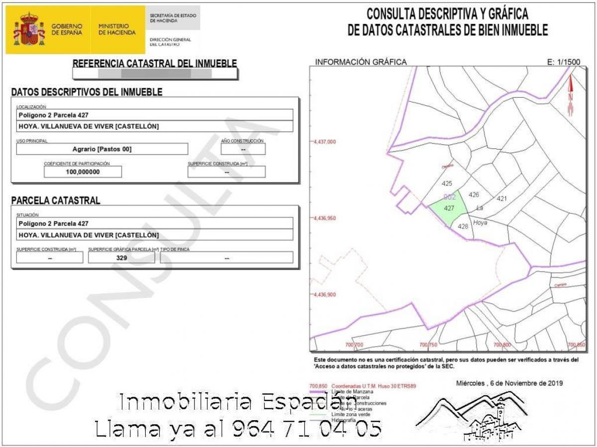 Superb Site and Plots of Land For Sale in Villanueva de Viver Castellon Comunidad Valenciana Spain Euroresales Property iD- 9825809 Property and Land information: Superb Site and Plots of Land around the Outskirts of Villanueva de Viver, Spain. Great Agricultural and Development Potential About the Area: Castellon)or Castello is a province in the northern part of the Valencian Community. it is bordered by the provinces of Valencia to the south, Teruel to the west, Tarragona to the north, and by the Mediterranean Sea to the east. The western side of the province is in the mountainous Sistema iberico area. Castellon's capital is Castellon de la Plana (Valencian: Castello de la Plana). The province had a population of 579,962 at the start of 2019,30% of whom were residing in the capital, 60% in its metropolitan area, and 85% along the coastline. As of the 2011 Census, the population had grown to 594,423 people, but has since declined. The province, and in particular its idle large airport, has become a symbol of the wasteful spending prior to the 2008-14 Spanish financial crisis. it is a bilingual territory whose inhabitants speak both Spanish and the local co-official language Valencian. Other major cities of the province include Vila-real, Borriana, La Vall d'Uixo and Vinaros. There are 135 municipalities in Castellon; see List of municipalities in Castellon. Castellon is the home of Penyagolosa, the highest mountain of the province. The Greenwich Meridian (the Prime Meridian) passes through the province; there are localities with commemorative monuments such as La Pobla Tornesa, Castellon or Almassora (Paseo Maritimo), and in Castellon it intersects the 40th parallel, and the exact point can be visited at the Meridian Park. Contact Euroresales Ltd for more information.