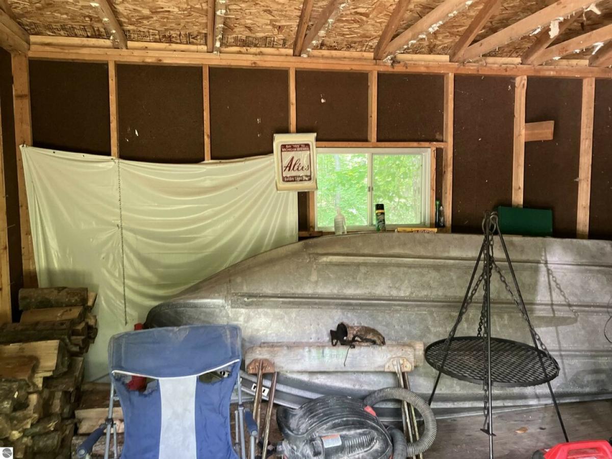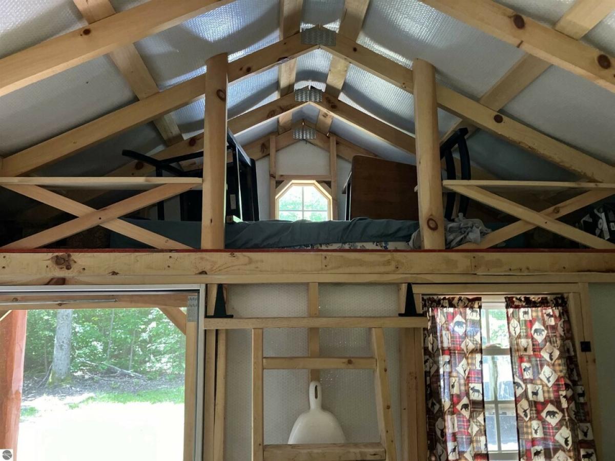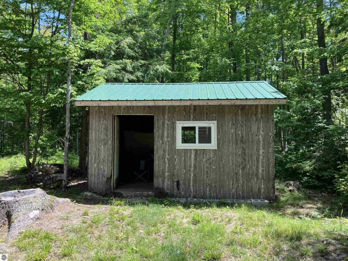 Kalkaska 10 Heathy acres 1000' Acres of State Land across the street, with Groomed Trails, 12 x 12 Insulated Amish Cabin with steel floor, 4 x 12 porch, new wood stove with loft and 15 x 16 storage building. Survey Stakes every 100ft on north south and West lines Must see with agent through Showingtime