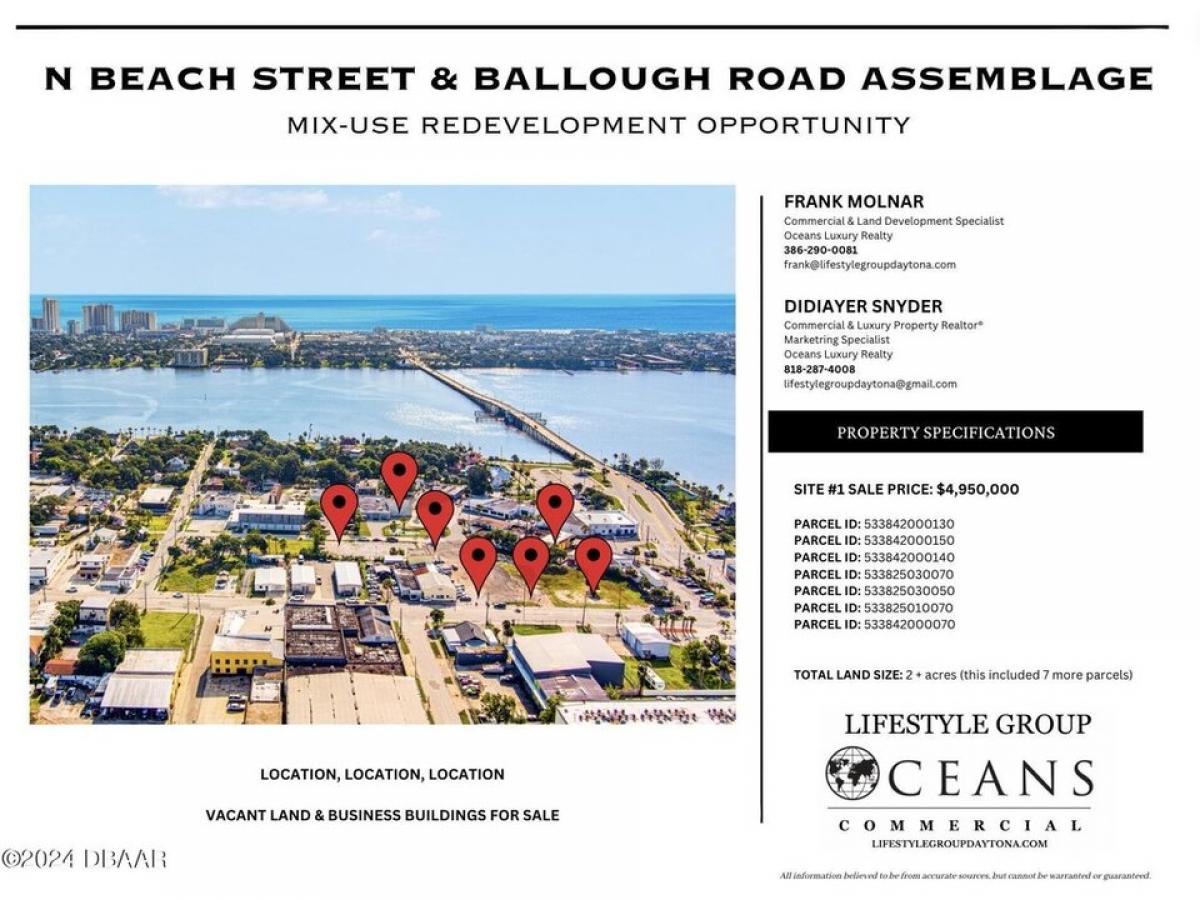 LOCATION, LOCATION, LOCATION!!! N BEACH ST, DAYTONA BEACH 32114 is being sold #039;#039;as is#039;#039; as part of 7 parcel assemblage. TWO PARCELS HAVE BUILDINGS ON THEM, THE OTHER PARCELS ARE VACANT LAND. PRIME LOCATION - MULTIPLE PARCELS READY FOR DEVELOPMENT. Bring all offers!!! Located in the Daytona Design District, which is connected to Downtown Beach Street is undergoing a transformation, and investors are now able to advantage of this opportunity and be a part of how this part of our city takes shape. These parcels are part of the Downtown Ballough Road Redevelopment Area Plan, with city grant opportunities for this area. All seven parcels are being sold together and include the following parcel IDs: 533842000070, 533825010070, 533825030050, 533825030070, 533842000150, 533842000140, a
