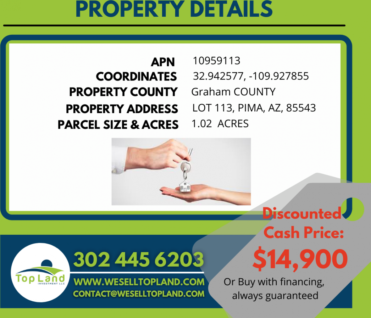 Heavily Discounted Cozy 1.02-Acre Rough Diamond in Graham County, AZ. Only 28 Minutes Outside Safford. Seller financing is always guaranteed, no banks or credit checks needed! If you're looking for a place to settle down with a lot of sunshine, scenic vistas, and vibrant culture, then this 1.02-Acre lot is perfect for you. Located less than half an hour away from downtown Safford, this lot enjoys its location's tranquil surroundings and the easy access to the city center. In Safford, the same modest cafés have been churning out excellent, home-style Mexican food for decades. Once you've filled your belly, there are lots of ways to work off the calories in this high-desert hometown. From mid-May through October, you can take a guided tour to Mount Graham International Observatory, on the highest point in the Pinaleno Mountains. At Gila Box Riparian National Conservation Area, Bonita Creek is home to frogs, javelinas, black bears, and more than 140 birds - bring your binoculars and a picnic lunch. All these and more. Call now. Title of Property: Title will be delivered Free and Clear once the property has been paid in full. State: Arizona County: Graham Address: Pima, AZ, 85543 Gps: 32.942619, -109.927872 Dimension: 155.03 ft x 298.96 ft x 152.56 ft x 298.01 ft Approx Apn: 10959113 Zoning: A-Zone - General Land Use Elevation: 2815.0 ft Terrain: Flat Taxes: $12.96 (2021) Hoa: No Road: Dirt Electric: Not yet connected but there is available company and has a road access Water: None, however a well is available in the neighborhood Sewer: None Phone: Cell or Landline Internet: Local service provider Build: Allowed Setbacks: 20ft front 10ft side 25ft rear RV: Not Allowed Mobile Home: Yes, with a permit