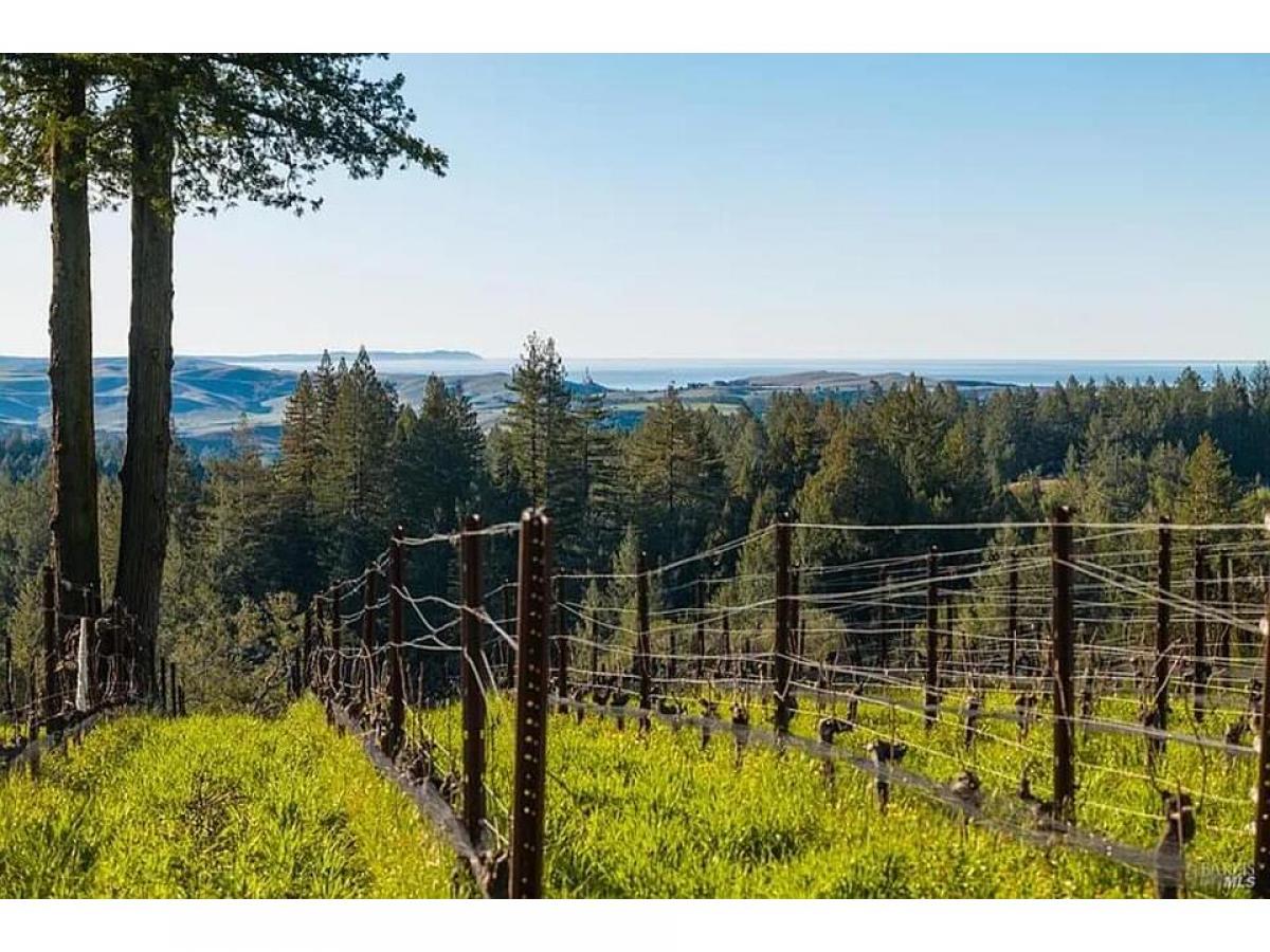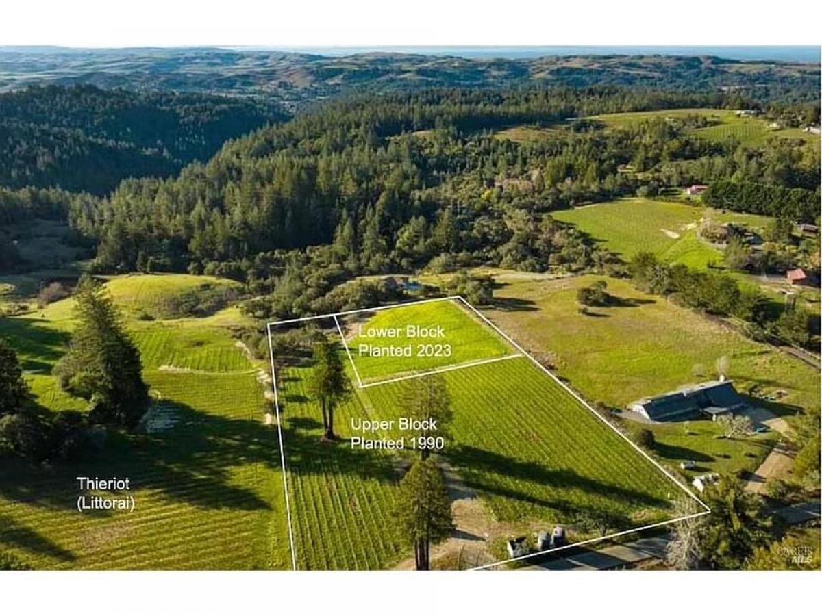 Taylor Lane, west of Occidental, is one of the most highly regarded premium Pinot Noir vineyard locations in west Sonoma County. Referred to as the Rodeo Drive of Pinot, at an elevation of 900+ feet this ridge-top spine extends from Joy Road westward to the Pacific overlooking Bodega Bay and Tomales Bay to the south. Offering optimal sun exposure with just the right amount of fog, ocean breeze influences, and well-draining soils, this terroir brings out the very best in Pinot Noir vines. The property totals 4.8 acres with 3.4 planted to vines. 2.1 acres in the upper blocks planted in 1990 are primarily Calera clones on 101-14 rootstock, perched on Goldridge fine sandy loam soils. 1.3 acres on the lower portion of the vineyard were replanted in 2023 to new rootstock allowing the next owner creative controlling clone selection. This vineyard has been farmed organically and is on the path to certification. There is a 1.5 GPM well with a new well site identified and permit in process, two 5,000 gallon water storage tanks, and an approved building envelope with plans for a 2 bedroom, 2 bath modern prefab by Connect Homes (permit-pending completion of second well).