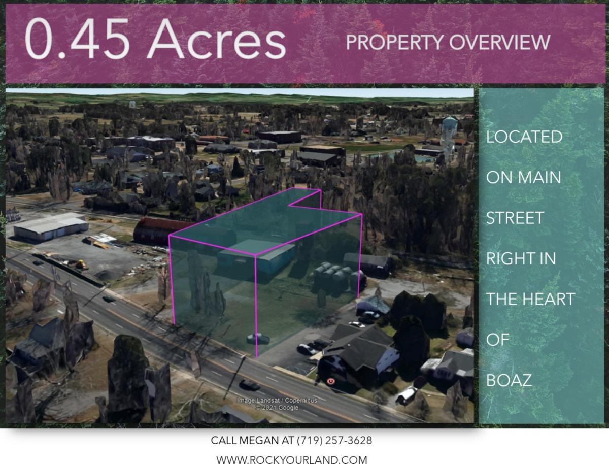 Sale Price: $9,998 (30% BELOW MARKET!) MUTIUSE NEIGHBORHOOD COMMERICAL INVESTMENT! Call or text: (719) 257-3628 or visit www.rockyourland.com This centrally located 0.45 Acre lot is in BOAZ, AL. A bustling community close to all kinds of tourist destinations, recreational activities, and more! Close to Huntsville (1 hr) and Birmingham (1 hr 15 min) and in town, close to all of the conveniences of small town life, but with a feeling close community. If you’ve ever thought of owning property to create a small business in perfect location, now is your chance to do it for a wholesale price on premium land! Don’t wait, this incredible property WILL go fast – call now! For more information visit www.rockyourland.com or call/text: (719) 257-3628 Own today for 20% below Market, only $79,998. No Realtors, No Commissions. Property Details: Location: N Main St. Boaz, AL Zoning: B-1 Neighborhood Commercial Distric Terrain: Flat, on Main Street Road Access: yes Market Value: $12,000+ DON’T WAIT! This property will go fast! Visit www.rockyourland.com or call/text: (719) 257-3628