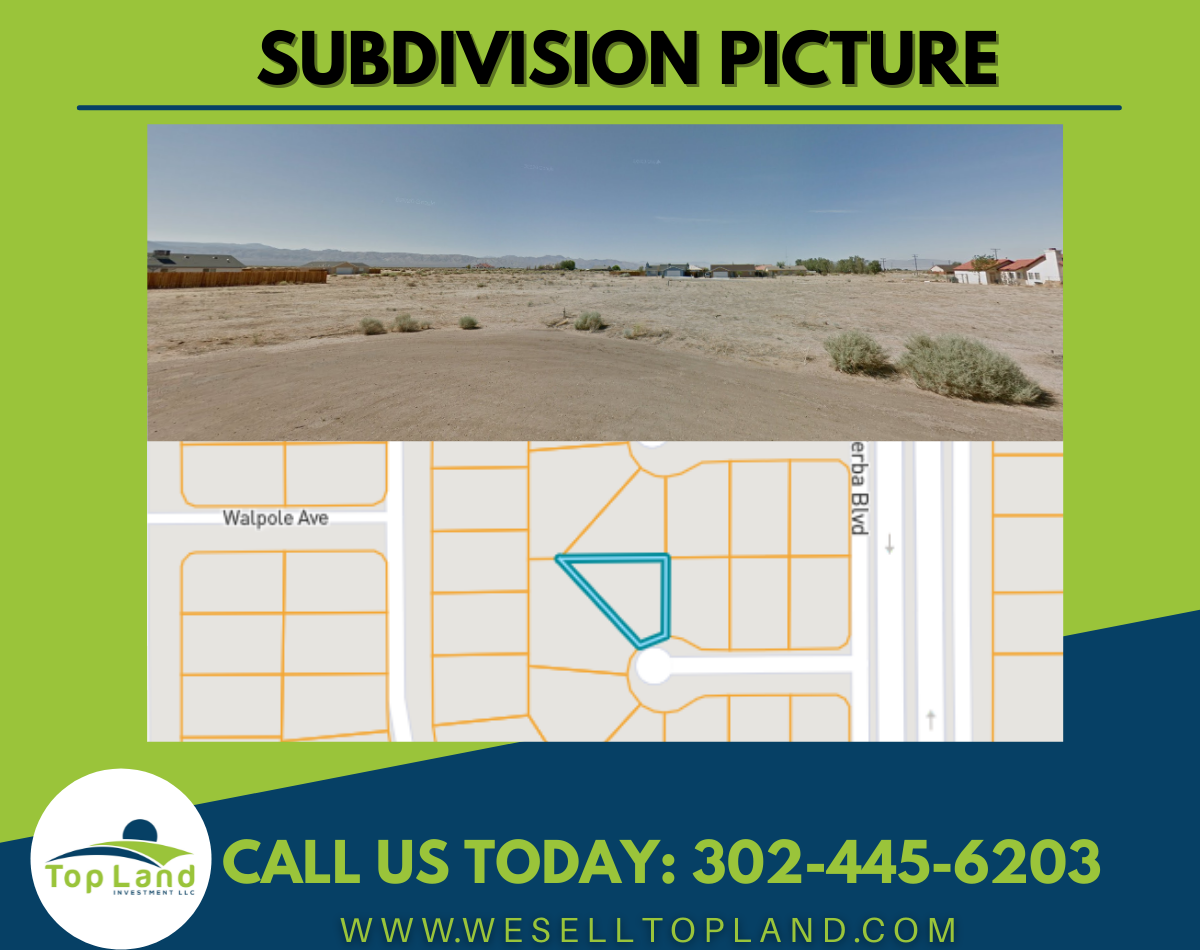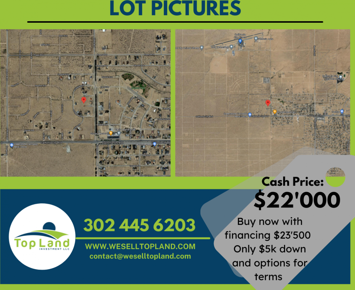 Secure your new favorite spot in the sweeping landscape of California’s High Desert Region and own this 0.22-acre rough diamond in Kern County, CA! Nestled along Dogbane Ave, in a cul-de-sac street, this lot offers excellent accessibility and a wide-open space! Also, your lot’s sweet spot makes the oases of Tehachapi and Lancaster reachable in less than 1 hour! If you’re an outdoorsy fellow, you’ll fit right in! Kern County is home to some of the best outdoor attractions in California! Whether you’re headed out to explore the trails, towns, or giant sequoias, this region is the perfect place to begin and end your day. Kern’s proximity to these attractions allows visitors to see more and spend less! What are you waiting for? Call now! Pricing Details: Cash Price: $22,000 Financed Price: $23,500 Down $5,000 Property Details: Parcel Number: 21805318 County: Kern County State: CA Parcel Size: 0.22 acres City: California Zip Code: 93505 Center GPS Coordinates: 35.128950, -118.004742 Corner GPS Coordinates: 35.129085, -118.005058 35.129089, -118.004592 35.128807, -118.004602 35.128767, -118.004708 Elevation: 2440.9 feet Property Access: Dirt