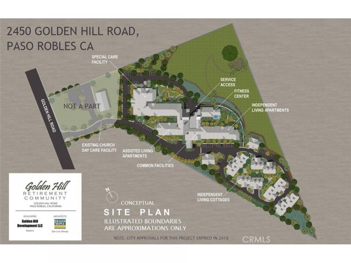 PASO ROBLES LAND DEVELOPMENT OPPORTUNITY! This well located 11.8 acre parcel awaits your imagination amp; future development. Currently zoned R3-PD (with a senior housing overlay). The site was previously approved for a 125 unit senior development (those entitlements expired in 2018), although the City of Paso Robles would certainly reconsider a similar senior project. But this site has many other possibilities, as the City has indicated that they would consider re-zoning proposals to either a lower density residential zoning or even increased density zoning depending on the use proposed. And per a city planner, removing the senior housing overlay is also a possibility, depending on the elements of a proposed new project. Gentle, rolling topography and limited traffic impact off Golden Hill Road provide a peaceful setting, which is further enhanced by the adjacent and picturesque Chandler Ranch. Quality homes are located on either side of the land, and the site is easily accessed from both Hwy 46E and the vibrant downtown Paso Robles... yet it maintains a distinctly rural feel. Consider a 55+ residential development, yielding homes priced between the Sierra Bonita/Turtle Creek developments and much more expensive Traditions, Vintage and new Trilogy project (currently under construction). A few conceptuals will follow next week to illustrate just a few of these ideas. As an added bonus, there is an existing 3 bedroom 2 bath 1,400SF home that is currently rented and will provide some permit credits and rental income until your new project breaks ground.