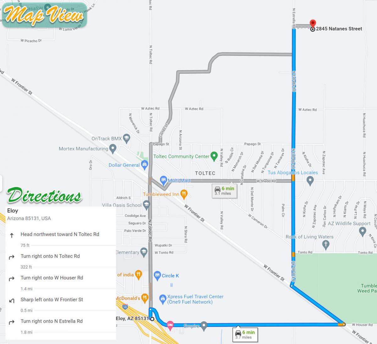 This 0.29 acre lot is located in Eloy, Arizona and the address is 2845 W Natanes Dr, Eloy, AZ 85131. Eloy is just south of Phoenix, less than a hour drive. Midway between Phoenix and Tucson, Eloy began as a planned community. Compared to the rest of the country, Eloy's cost of living is 18.7% lower than the U.S. average. It's a good time to buy in Eloy. Home Appreciation is up 12.5% in the last 12 months. Features: Adjoining Lot available Only $200 Down and $200/month for 33 months = $6800 or Discounted Cash Price: $5500 PROPERTY DETAILS APN: 402-18-277 Address: 2845 W Natanes Dr, Eloy, AZ 85131 County: Pinal State: Arizona Size: 0.29 Acre Dimensions: 100' x 128' x 101' x 126' Legal: TOLTEC ARIZONA VALLEY 21 LOT 7 IN BLK M Terrain: Flat Access: Dirt Road Power: Power in the area Water: Water in the area Sewer: Would be by Septic Taxes per Year: $16 HOA Fees per Year: No HOA/POA GPS Coordinates (center) at the road: 32.807414, -111.599850 --- Northwest Corner: 32.807587, -111.600019 --- Northeast Corner: 32.807587, -111.599696 --- Southwest Corner: 32.807237, -111.600018 --- Southeast Corner: 32.807237, -111.599693 Elevation: 1505 BUILDING INFORMATION Zoning: AZ-Pinal-Eloy-R1-12 Single-Family Residential Time Limit to Build: No time limit to build Site Built Homes Allowed: Allowed Modular Homes Allowed: Allowed Manufactured Homes Allowed: Not Allowed Mobile Homes Allowed: Not Allowed Tiny Homes Friendly: Yes, as long as it site built ALLOWABLE USES Full-Time RV Living Allowed: Not Allowed RV on the Property While I build: Not Allowed Camping in a RV Allowed: Not Allowed