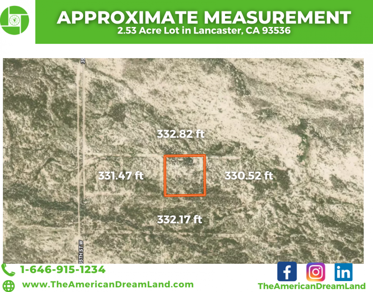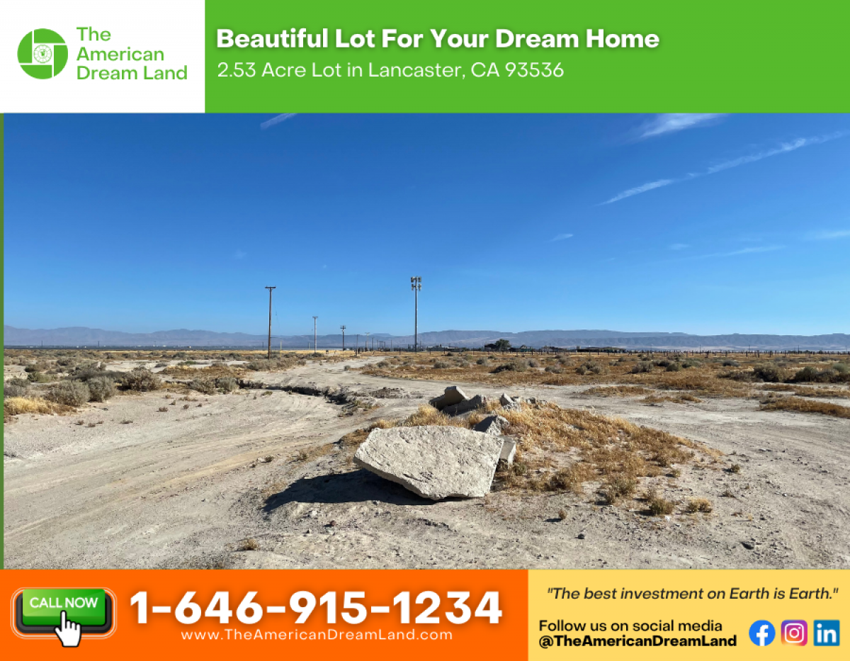 This 2.53 acre lot is located in Lancaster, CA. Perfect for your dream project or building your dream home, a ranch or an agricultural project, the possibilities are endless! Here’s why this property is a good investment? · Below Market Price · Low taxes · Flat Terrain with beautiful mountain views · Mobile homes and Off grid living or recreational home · Close to Lancaster, California (15 min, 9.1 miles) Property Details: · Property Type: Vacant Land · Parcel #: 3115-009-005 · Parcel Size: 2.53 acres · Property Address: Lancaster, CA, 93536 · County and State: Los Angeles County, CA · Legal Description: 2.5 more or less acs sw 1/4 of ne 1/4 of sw 1/4 of ne 1/4 of lot/sec 18 blk/div/twn 8n reg/rng12 · Land Use: R-A (Residential Agricultural) · Road Access: Dirt Path · Utilities: All utilities should be brought in the area. · Annual Taxes: $527.63 approximately · GPS Coordinates: 34.7863, -118.1907 34.7868, -118.1902 NE 34.7859, -118.1902 SE 34.7859, -118.1913 SW 34.7868, -118.1913 NW · Google Map link: https://goo.gl/maps/amNzHL9VEFTgbcLr7 We provide wholesale discounts on all of our real estate sales! We'll work with you to find the property of your dreams! We also offer flexible financing options. Call us now at 1-646-915-1234 or send an email to sales@americandreamland.com to discuss more! NOTE: Buyer responsible for own due diligence regarding property, it’s use codes, obtaining permits, connecting utilities, and any other future plans the buyer can conceive. Land is sold as-is, where-is with buyer paying all closing costs. Price based on an all-cash purchase.