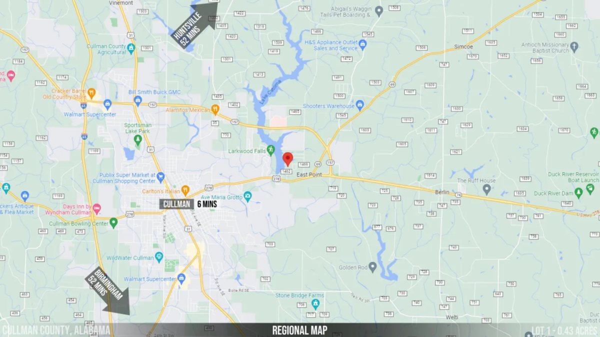 Cheap Land in Alabama on Lake Catoma Just 6 minutes from downtown Cullman, come home to this build-ready lot in the Eastern Shores at Catoma subdivision that looks and feels like an exclusive HOA lot but without the HOA! All Utilities Along StreetNo HOA!Very Buildable: Flat, Cleared, No FloodplainDirect Road FrontageSurveyedNew, Peaceful NeighborhoodAward-Winning SchoolsPriced about 44% Below Market PROPERTY: Welcome to the Eastern Shores at Catoma, featuring this newly platted 0.43 acre lot that delivers the look and feel of a high-end, lakeside HOA community, only without the actual HOA – the best of both worlds! The flat and cleared terrain will jumpstart your building project, and you have no floodplain encroachments that will interfere either. So get started building your new home immediately! Lake Catoma, which is prominantly in view from your future front porch, spans 536 acres and is open to boating and fishing – offering up a wealth of largemouth bass, catfish, and crappie – and anchors a vast network of hiking trails within this Alabama Mountain tourism region. Your driveway will connect to County Road 1462, which is lined with power, water, and sewer lines. The CC+R’s for this subdivision are light and allow for a wide variety of home designs, and the survey plat is readily available so you can get started planning your next dream home today. You have your choice between Lot 1 (0.43 acres) or Lot 2 (0.44 acres) and once you’re established, you’ll love sending your kids to one of the best public school districts in the state. In fact, GreatSchools.org gave the elementary and middle school here a 10 out of 10 rating! Downtown Cullman is just 6 minutes away, and it offers a Walmart, Lowe’s, several grocery stores, local restaurants, fast food chains and medical centers, but if you’re looking for the full range of big-box retailers, you can find them in Huntsville, just 52 minutes to the north, or the capital city of Birmingham, the same distance to the south. Be among the first to settle this beautiful, serene lakeside neighborhood, and get in at an unbeatable Acretown price! The best and most updated source of information on this property will always be at https://www.acretown.com/cullman12 This is one of five offerings in this subdivision: Lot 1 = 0.43 acresLot 2 = 0.44 acresLot 1+2 combo = 0.87 acresLot 23 = 0.61 acresLot 33 = 0.66 acres Call or text Scott directly at 314.639.9777 or email info@acretown.com if you have any questions or would like to make an offer. We’ve posted a lot of info below – including critical instructions for visiting the property – so please keep reading! Best Deal in the Market – Check Zillow or Realtor and You’ll Agree! After opening this map, you may see even more information about the area by clicking on Map Legend, then Overlays. ADDRESS (street # estimated – use GPS for navigation):Lot 1 = 404 County Road 1462, Cullman AL 35055Lot 2 = 408 County Road 1462, Cullman AL 35055SIZE:Lot 1 = 0.43 acresLot 2 = 0.44 acresGPS COORDINATES:Lot 1 = 34.184068, -86.801434Lot 2 = 34.184286, -86.801443APN:Lot 1 = 17-01-12-0-001-060-002Lot 2 = 17-01-12-0-001-060-003ABRIDGED LEGAL DESCRIPTION:Lot 1 = Lot 1 of Eastern Shores at Catoma, Plat Book 2021, Pages 41-42, Probate Office of Cullman County, AlabamaLot 2 = Lot 2 of Eastern Shores at Catoma, Plat Book 2021, Pages 41-42, Probate Office of Cullman County, AlabamaFULL LEGAL DESCRIPTION: download herePLAT MAP/SURVEY: download hereGOOGLE EARTH BOUNDARY (KML) FILE:Lot 1Lot 2TITLE: General Warranty deed (clean – no back taxes, no liens)DIMENSIONS (approximate):Lot 1 = starting at NW corner, 250′ E x 73′ S x 238′ W x 81′ N (along road) to POBLot 2 = starting at NW corner, 262′ E x 77′ S x 250′ W x 75 ‘N (along road) to POBFLOODPLAIN: none, no wetlandsELEVATION: 770 feetTERRAIN: flatCONDITION: undeveloped, clearedACCESS:Lot 1 = 81 feet along County Road 1462Lot 2 = 75 feet along County Road 1462POWER: available at streetWATER: available at streetWASTEWATER: available at streetTAXES: $101.40 paid in 2022 by other vacant, similar-sized, waterfront lots in this neighborhood (our lots are newly platted)HOA: noneHOA FEES: noneRESTRICTIONS: Eastern Shores at Catoma CC+R’s (see full doc here; summarized below)minimum home size:off-waterfront lot: 1500 sfwaterfront lot: 1700 sfsetback = 75 feet from 750′ lake elevation levelno piers/docks on waterfrontguest houses OKno pre-fab/modular/mobile homesexterior construction must finish within one year of beginning (RV’s during construction OK)no farm animals (pets OK)SCHOOL DISTRICTS: East (Elementary) – Cullman (Middle School) – Cullman (High School)NEAREST CITIES: Cullman BirminghamNEAREST AIRPORTS: Cullman Regional (16 mins), Birmingham International (57 mins)COUNTY GOVERNMENT:Assessor (256) 775-4776Clerk/Recorder (256) 775-4807CITY GOVERNMENT:Planning Zoning (256) 775-7203Water Wastewater (256) 775-7210 You can go view the property at your convenience – owner does not need to accompany. Please call/text us to let us know you’re heading out, so we can (1) confirm its availability (our land does sell fast), and (2) ensure we have our phone on us in case you need help or have any questions. We’d appreciate a couple hours notice if possible. In case you lose cell phone service, it may be helpful to print off as many helpful documents as you can before you head out there. DRIVING DIRECTIONS: Click HERE to open the destination in Google Maps, and simply enter your starting point to get step-by-step directions. From this link, you can press Directions (on the left), enter your starting point, and Google Maps will provide you with step-by-step directions.You can also click Send to Phone if you’re viewing this on your computerAnd Save to download the directions so they’ll still work if you lose cell service. If for some reason you’re having trouble with that link, you can navigate to GPS coordinates 34.184068, -86.801434