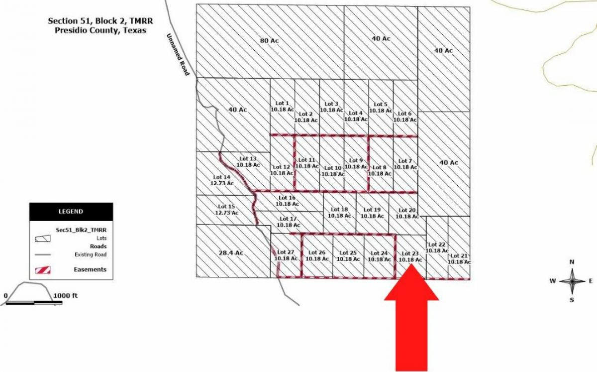 Your gateway to forever begins here! Claim this property in Texas and live your best life daily. Enjoy cascading mountain views, rolling hills, and plains in the distance. This 10.18-acre lot, perfect for country living, is the best place to take things slow or live life your own way. This property is an excellent introduction to off-grid living, perfect for a home or new homestead. Here’s your chance to build your eco-friendly home away from it all and reap the benefits of owning this rare beauty. 852Q8822+WV, Presidio, TX 79845 Parcel: Lot 23 Lot Size Acres: 10.18 Property Type: Vacant Land Zoning: Recreational, Residential Utilities: Please Contact County Deed Type: Special Warranty Deed Road Access: Dirt Road County: Presidio GPS: 30.302373, -104.697835 Legal: LOT 21 A ±10.18 ACRE TRACT OUT OFSECTION 51, BLOCK 2, TM RR COMPANY SURVEY, Description LOT 23 A ±10.18 ACRE TRACT OUT OF SECTION 51, BLOCK 2, TM RR COMPANY SURVEY, Being a tract out of Section 51, Block 2, TM RR Company Survey, Presidio County, Texas, and being more particularly described as: BEGINNING: At a point 4088.17 feet S 00° 08#39; 46quot; W and 3557.30 feet S 89° 11#39; 34quot; E of the Northwest Corner of said Section 51 for the Point of Beginning at the northwest corner of the tract; THENCE: S 89° 11#39; 34quot; E for 552.30 feet to the northeast corner of the tract; THENCE: S 00° 09#39; 14quot; W for 796.37 feet to the southeast corner of the tract; THENCE: N 89° 11#39; 34quot; W for 564.33 feet to the southwest corner of the tract; THENCE: N 00° 48#39; 46quot; E for 796.33 feet to the Point of Beginning at the northwestern corner of the above referenced tract and containing 10.18 acres of land, more or less. This tract is subject to all easements of record and there is a twenty (20’) foot access and utility easement along the north, south and west sidelines of the tract. The foregoing description is based upon maps and data provided by the owner, the Texas General Land Office and the Texas Railroad Commission and has not been surveyed as of this date.