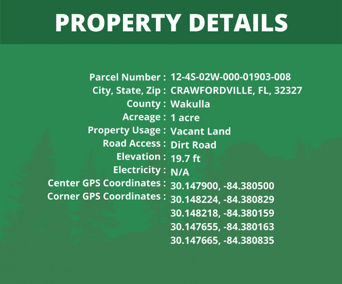 Experience the freedom of owning your own stunning 1-acre lot, nestled in the serene landscapes of Crawfordville. This amazing land offers endless possibilities for both enjoyment and utility. Conveniently located just a few minutes away from a dirt road, you'll have easy access to several towns and cities. This lot allows you to get away from the frantic pace of city life, bringing the comfort and tranquility only possible through owning your own piece of nature. Additionally, you're only a brief 33-minute drive from the bustling city of Tallahassee, FL. Here, you can avail yourself of a host of amenities such as: • Vibrant cafes for the perfect coffee break or brunch. • Numerous parks offering vast green spaces for relaxation or recreation. • Luxurious spas providing wellness and self-care opportunities. • And an abundance of other offerings that enrich life's daily experience. With this stunning 1-acre lot, you can enjoy the best of both worlds - peaceful rural living with the amenities of a city within easy reach. OWNER FINANCING AVAILABLE!! Down payment of $3,980.00 Plan A: $493.07/month for 48 months Plan B: $386.63/month for 72 months Plan C: $335.69/month for 96 months Property Details: APN: 12-4S-02W-000-01903-008 City: CRAWFORDVILLE County: Wakulla State: Florida Road Access: Dirt Zoning: Agricultural District Mobile homes: Allowed Stay away from the noise of city life and enjoy building your dream home here! Contact us today at (844) 900-0110 or via email: deals@bargainplots.com to learn more and finally own it.