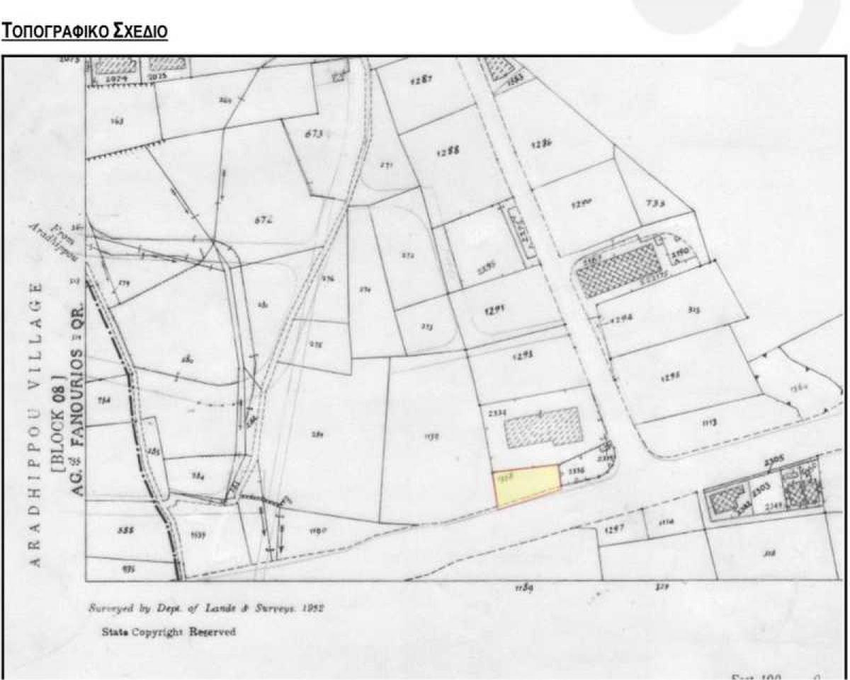Σύμφωνα με το επίσημο κτηματικό σχέδιο, το υπό εκτίμηση ακίνητο εφάπτεται εγγεγραμμένου ασφάλτινου δρόμου - Λεωφόρος Ελλάδος κατά μήκος του νότιου του συνόρου, διαθέτει νότιο προσανατολισμό και πρόσοψη στο δρόμο περί τα 43 μέτρα. Επίσης, κατά μήκος του ανατολικού του συνόρου, εφάπτεται με χώρο πρασίνου.
