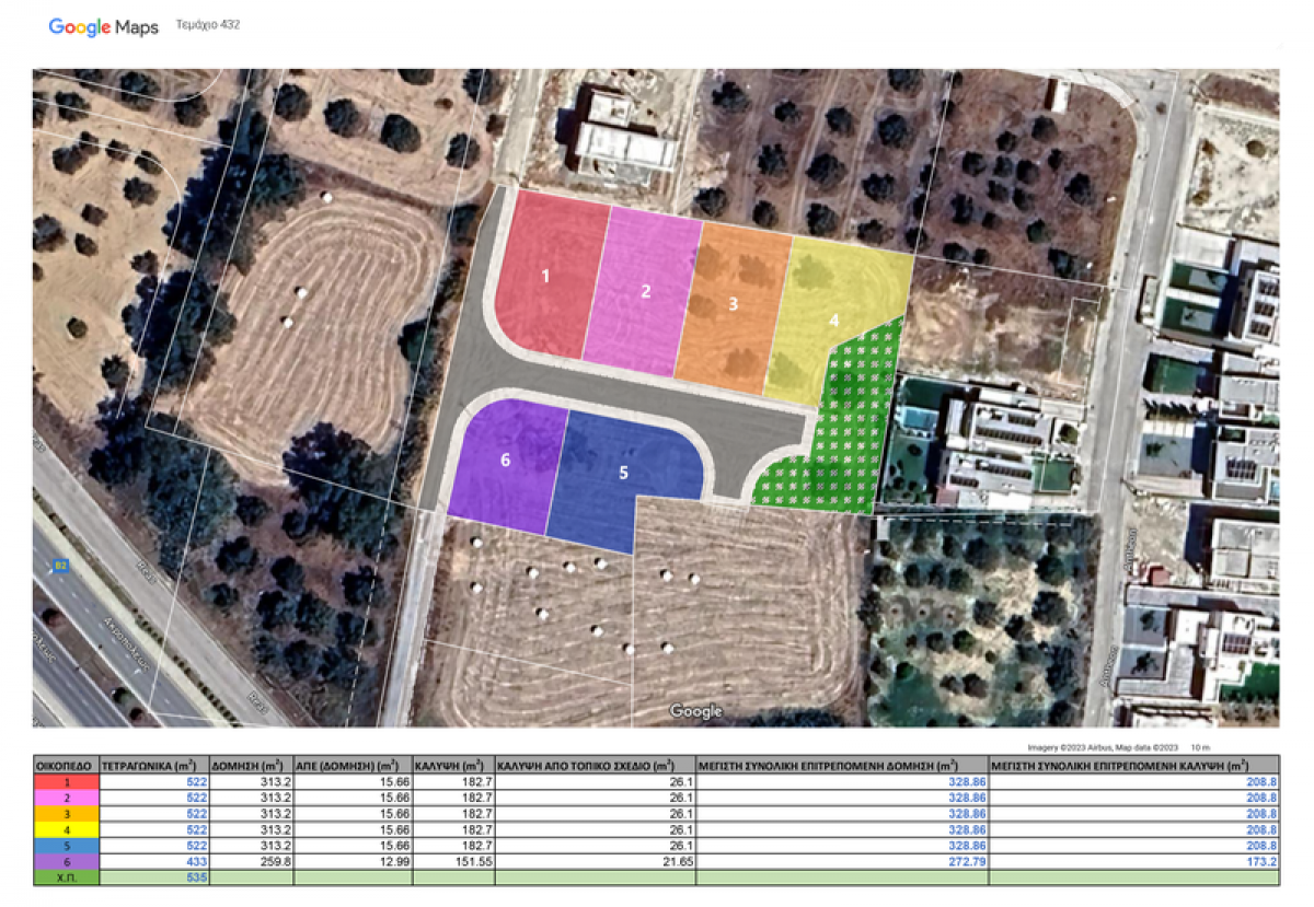 The development consists of 6 plots. There are two corner plots (1 & 6), one of 522 m2 and one of 433 m2, two rectangular plots (2 & 3) of 522 m2, and two polygon-shaped plots (4 & 5) of 522 m2 with one of them (5) being also a corner one and the other one located next to the park. The plots are accessed by a central road leading to a cul-de-sac, which creates a feeling of privacy and safety, with a public park at the end including a landscaped playground.