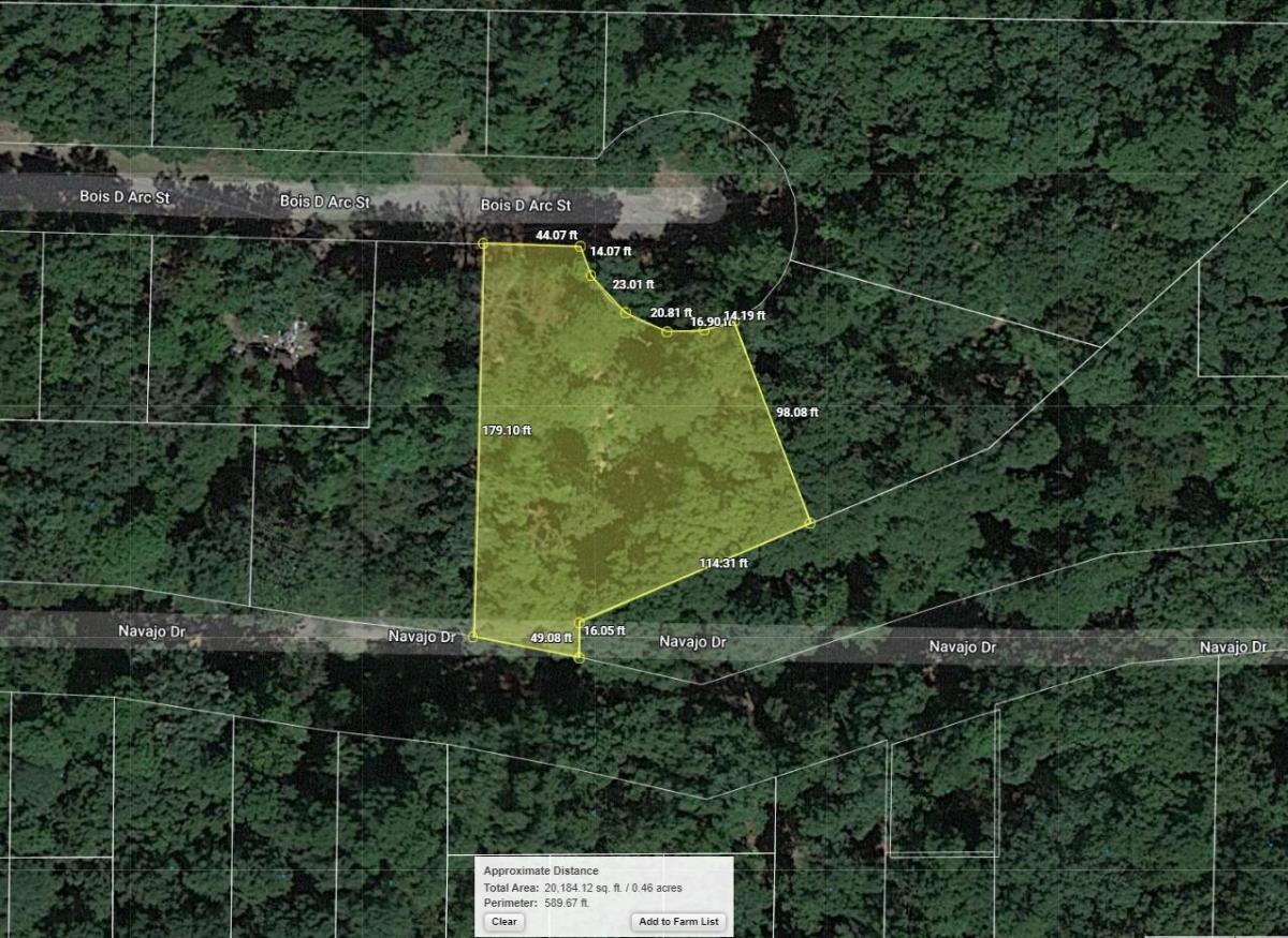 This 0.46 acre lot is located in Avinger (Indian Hills), Texas and the address is Bois D' Arc Drive, Avinger, TX 75630. Avinger is located 152 miles East of Dallas, Texas and sits just 15 miles or 20 minutes North of The Lake O' The Pines. Lake O' the Pines includes about 18,700 acres of water and 9,000 acres of land located in the piney woods of Northeast Texas. Recreation opportunities are numerous with camping, boating, fishing, hunting, watchable wildlife, and bird watching, including wintering bald eagles. Features: In a cul-de-sac, Close to Lake O the Pines Only $300 Down and $250/month for 56 months = $14300 or Discounted Cash Price: $11500 PROPERTY DETAILS APN: 11755 Address: Bois D' Arc Drive, Avinger, TX 75630 County: Marion State: Texas Size: 0.46 Acre Dimensions: 135' x 180' x 165' x 99' Legal: INDIAN HILLS SEC B LOTS 128, 129 AND 170 Terrain: Flat Access: Paved Road Power: Power in the area Water: Water in the area Sewer: Would be by Septic Taxes per Year: $52 HOA Fees per Year: $87 GPS Coordinates (center) at the road: 32.823309, -94.624117 --- Northwest Corner: 32.823533, -94.624323 --- Northeast Corner: 32.823465, -94.623958 --- Southwest Corner: 32.823100, -94.624341 --- Southeast Corner: 32.823226, -94.623831 Elevation: 312 BUILDING INFORMATION Zoning: TX-Marion-Avinger-Indian-Hills-Harbor-Sec-A-B-C-D Time Limit to Build: No time limit to build Site Built Homes Allowed: Allowed 600 min sqft Modular Homes Allowed: Allowed Manufactured Homes Allowed: Allowed Mobile Homes Allowed: Allowed Tiny Homes Friendly: Not Allowed ALLOWABLE USES Full-Time RV Living Allowed: Not Allowed RV on the Property While I build: Allowed Camping in a RV Allowed: Allowed 14days max a month