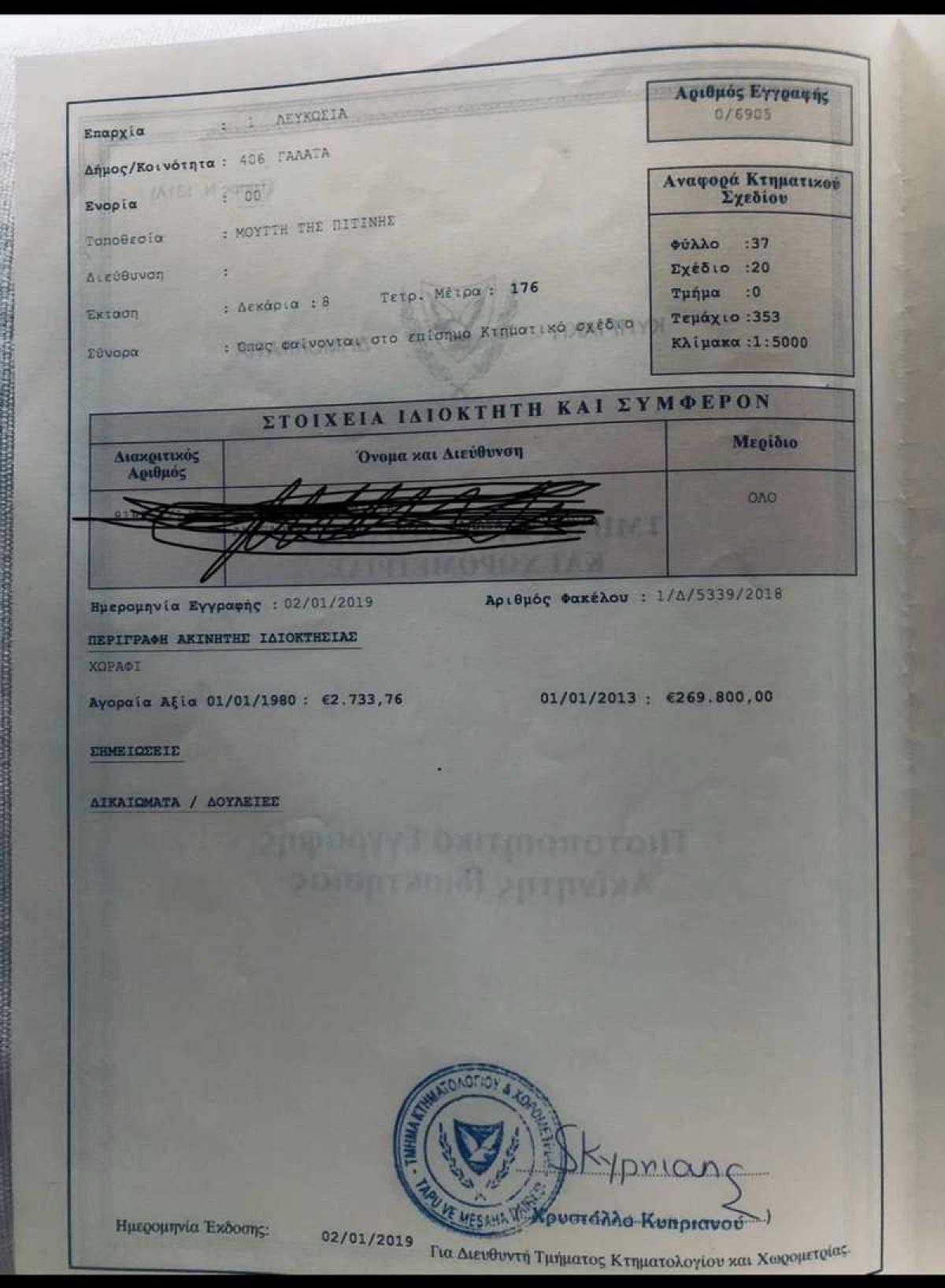 8176 τ.μ. αγροτική γη που βρίσκεται στη Γαλάτα,(Εσσω Γαλάτα).επαρχία Λευκωσίας.Προνομιούχο τεμάχιο γης με άμεση πρόσβαση σε δύο δρόμους και πολύ κοντά στο χωριό της Κακοπετριας. Εμπίπτει στην οικιστική ζώνη Η6 με 20% συντελεστή δόμησης, 20% συντελεστή κάλυψης και δυνατότητα ανέγερσης 2 ορόφων με ύψος 8.3 μέτρων. Το τεμάχιο διαθέτει ηλεκτρική παροχή και παροχή νερού. Επίσης διαθετει εξαιρετική θέα προς τον κόλπο της Μόρφου.Αρ. εγγραφής: 0/6905