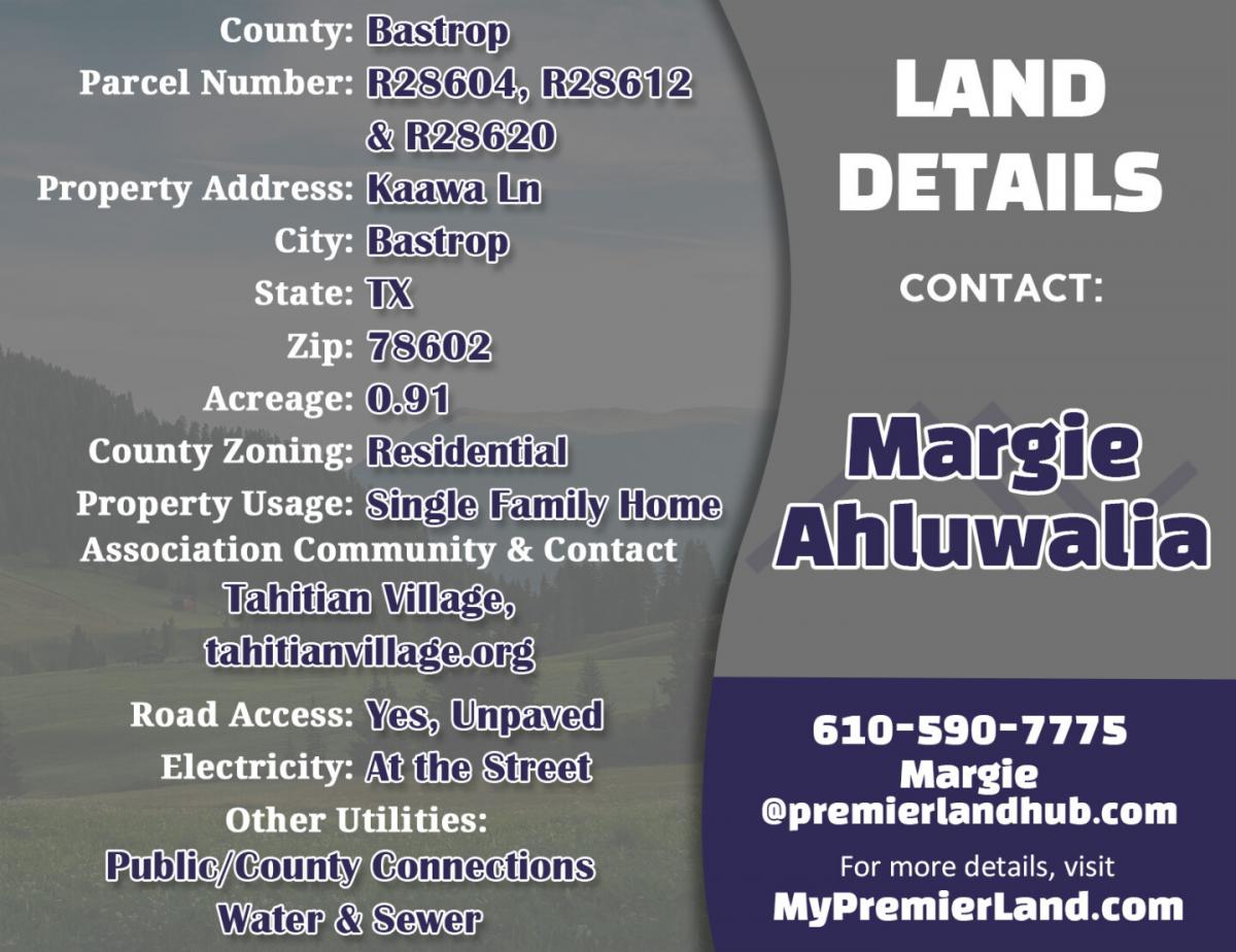 0.91ac 3 Lot Bundle in Bastrop TX. Austin only 40 mins away. Similar lots sell for $220,000. Ours is on Sale for only $90,000 Cash OR put $22,500 down to make $892.02 monthly payments ~~ Contact Margie Ahluwalia to learn more: 610-590-7775 - margie@premierlandhub.com ~~ WHY BUY?: #1. Privacy, Privacy, Privacy~Tucked away in Tahitian #2.Location! Location! Location! Only 40 mins from Austin and 1.5 hours from San Antonio Quick commute to Bastrop shopping, schools and only 35 minutes from the Austin Airport. #3. Multiple Purchase Options Available priced 59% Below Value! Finance with $22,500 down and $892.02 monthly payments. (This does not include taxes and service fee) OR buy with cash for only $90,000 COMMUNITY DETAILS: Bastrop is a great, growing town with plenty of entertaining activities. These lots sit about 45 minutes outside of Austin and 2 hours from Houston and San Antonio. This town is perfect for young families, someone looking for a more affordable living near Austin or even retirees wanting to escape a city life! Plus this area is great for camping, fishing, hunting and don’t forget it’s jam packed with amenities! This is a one of a kind place, come see it for yourself! USAGE DETAILS: - Single Family Home (per lot) PROPERTY DETAILS: - Lot Type - Land - Sale Price - $90,000 - State - Texas - County - Bastrop - Assessor's Parcel Number - R28604, R28612, R28620 - Property Usage - Single Family Home - Property Address - 0 Kaawa Ln, 559-561, Bastrop TX 78602 - Association Community Contact - Tahitian Village, tahitianvillage.org - Size - 0.91 Acre(s) - Road Access - Yes, Paved - Electricity - At the Street - Water Sewer - Public / County connections - Market Value - Similar-sized lots in the area are listed for $220,000 ACCESS DETAILS: - Kaawa Ln is an unpaved road. - Lot GPS Coordinates: 30.075375, -97.297734, 30.075236, -97.297558 30.075096, -97.297384 - 115 Kaaawa Ln is the address to the neighbors' house, which is down the street from the lot POPULAR ATTRACTIONS: - Colorado River, 5 minutes away - Get your kayak/pontoon/boat ready for a great outdoor adventure! - Bastrop State Park, 11 minutes away - This is a great place to camp or to let your kids run free at the playground. - McKinney Roughs Nature Park, 21 minutes away - The hiking trails here, go on for miles and offer beautiful overlooks of the river! - Capital of Texas Zoo, 27 minutes away - Definitely one of the most friendly zoos you’ll visit and I mean that in terms of employees and animals. PURCHASE OPTIONS: You can make this lot yours with only $90,000 cash OR put $22,500 down to make $892.02 monthly payments (does not include taxes and service fee) GOT QUESTIONS? WE HAVE ANSWERS!: - Call/Txt/Email Margie Ahluwalia @ 610-590-7775, margie@premierlandhub.com - We may have other properties at bargain prices available. All you have to do is ask! - Don’t hesitate! Connect with us today while this deal is still Available! DISCLAIMER: Buyer must verify work with County to know what can can't be done with the land, obtain proper permits if needed confirm the availability of any utilities needed/serviced on the lots. Seller makes no warranties or representations about the land, its condition, or what can be built on the parcel.