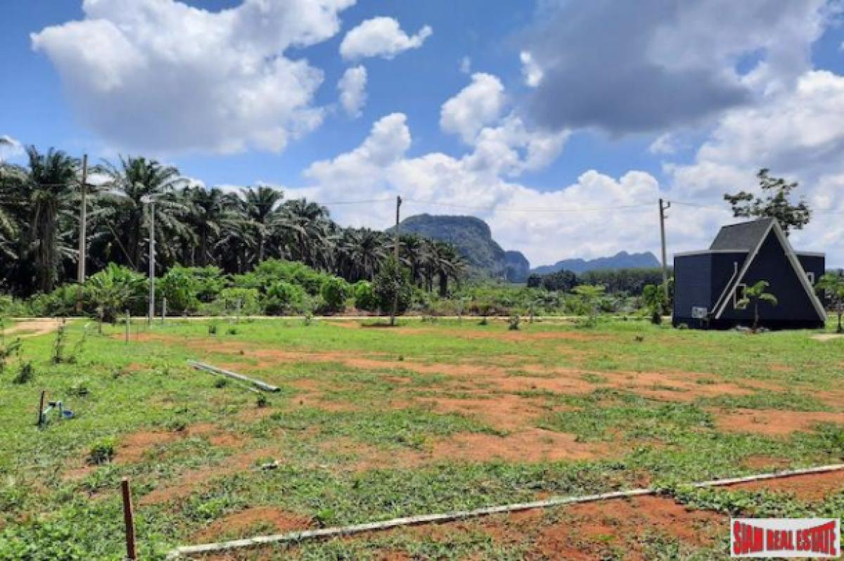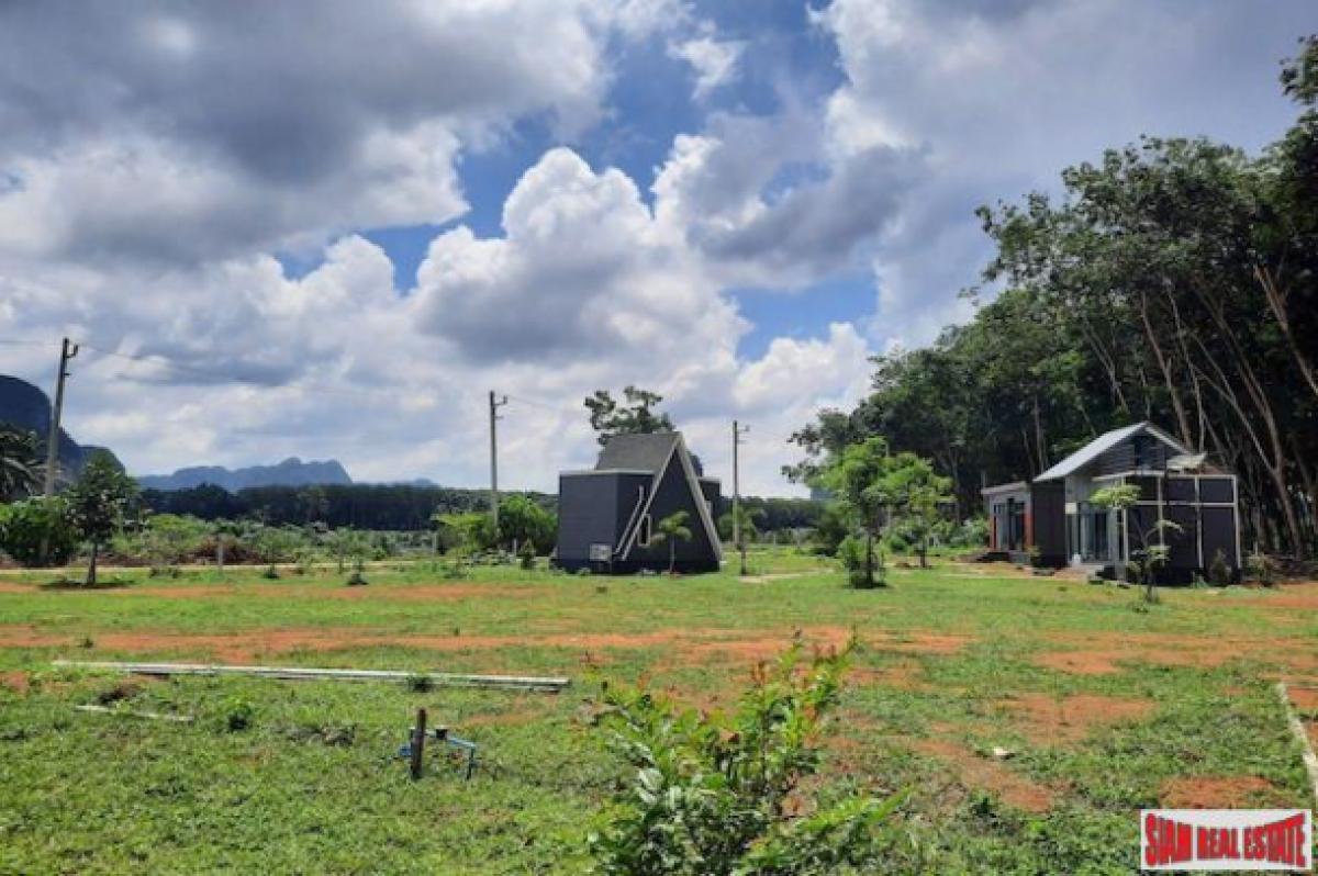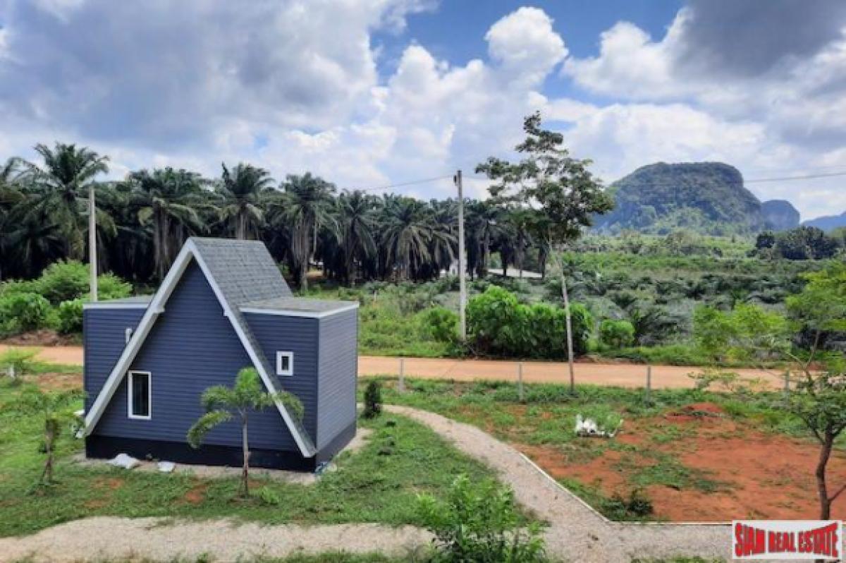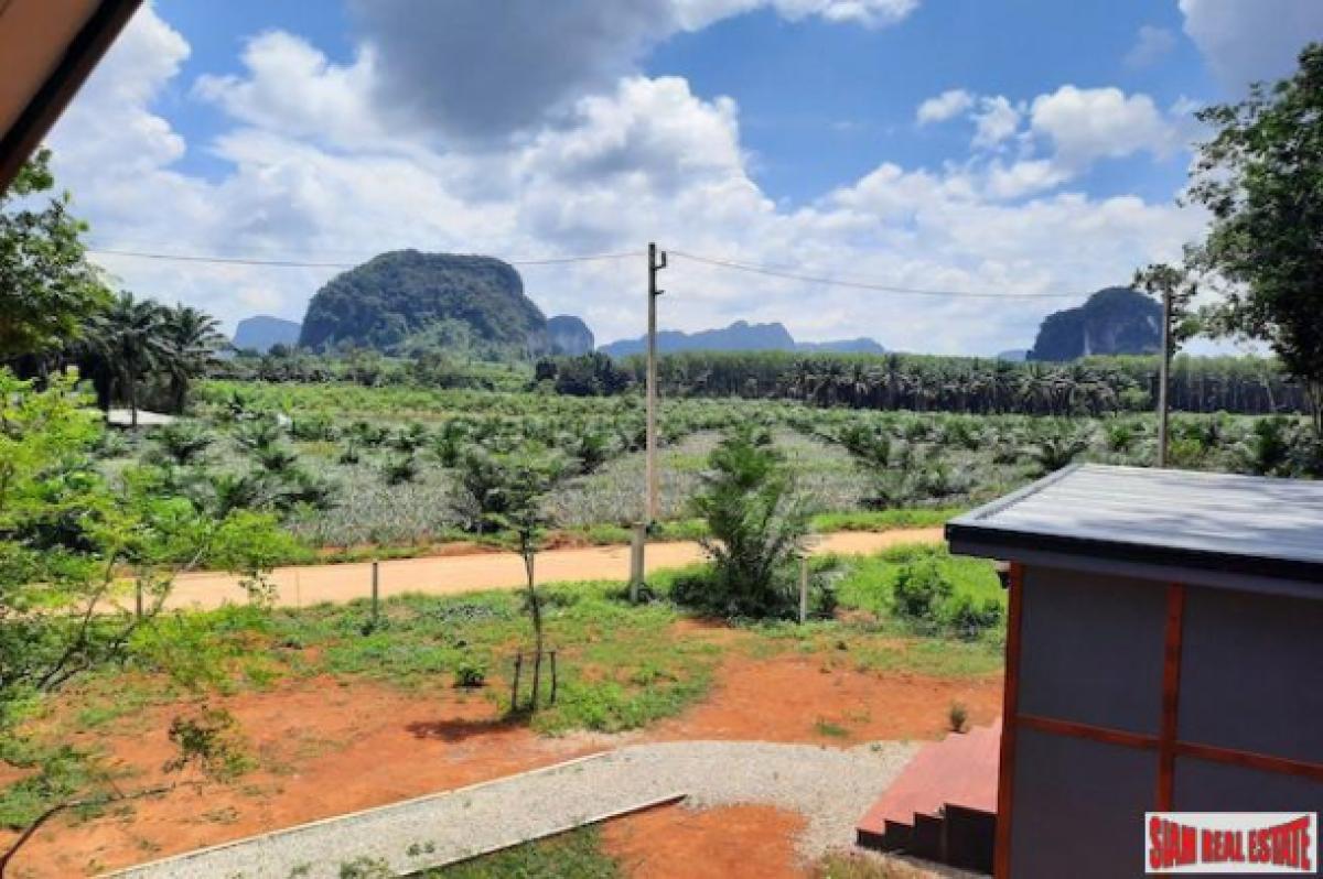 This is a good sized land plot for sale in a quiet and sparsely populated area of Nong Thalay, Krabi. The front view is of the spectacular Krabi mountains and the side area is a rubber plantation and a mountain with a cave.The land size is 1,917.6 sqm large and has three small houses on the property. In addition there is a building for a kitchen and a shared bathroom. There is lots of space to building a big house or more small houses for a resort business.