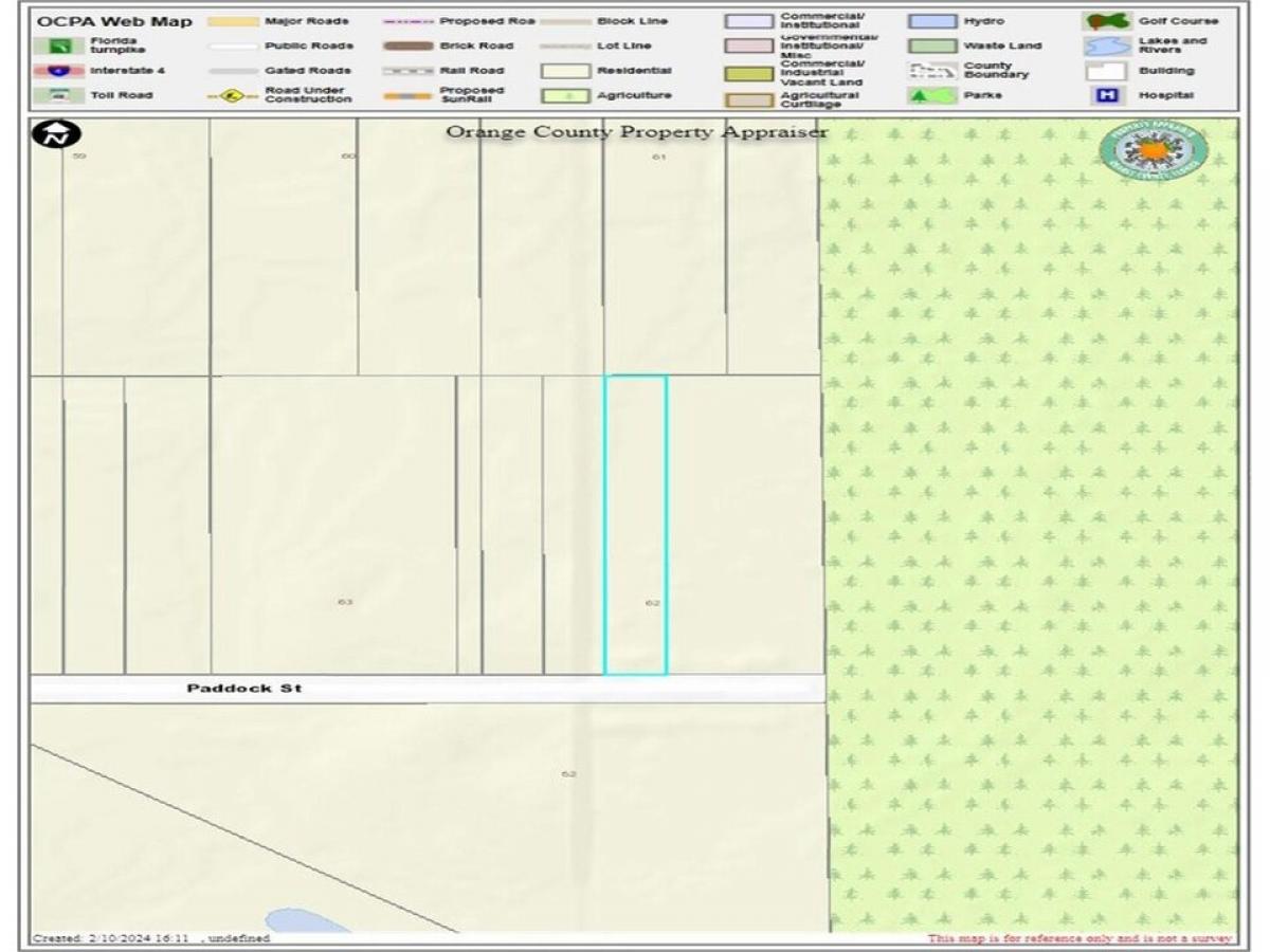 Well here is the last lot of a three lot set for a total of 3.24 acres. The other two lots are MLS O6025556. All three lots must be sold together as per Orange County Zoning and Planning. Asking $159900 for the set. They are all zoned A-2 and they all have some, not measured or confirmed with study, wetlands in the front and uplands in the back portion. The neighbor to the West has been nice enough to clear some the first lot to past his property line. Critters allowed in this zoning.